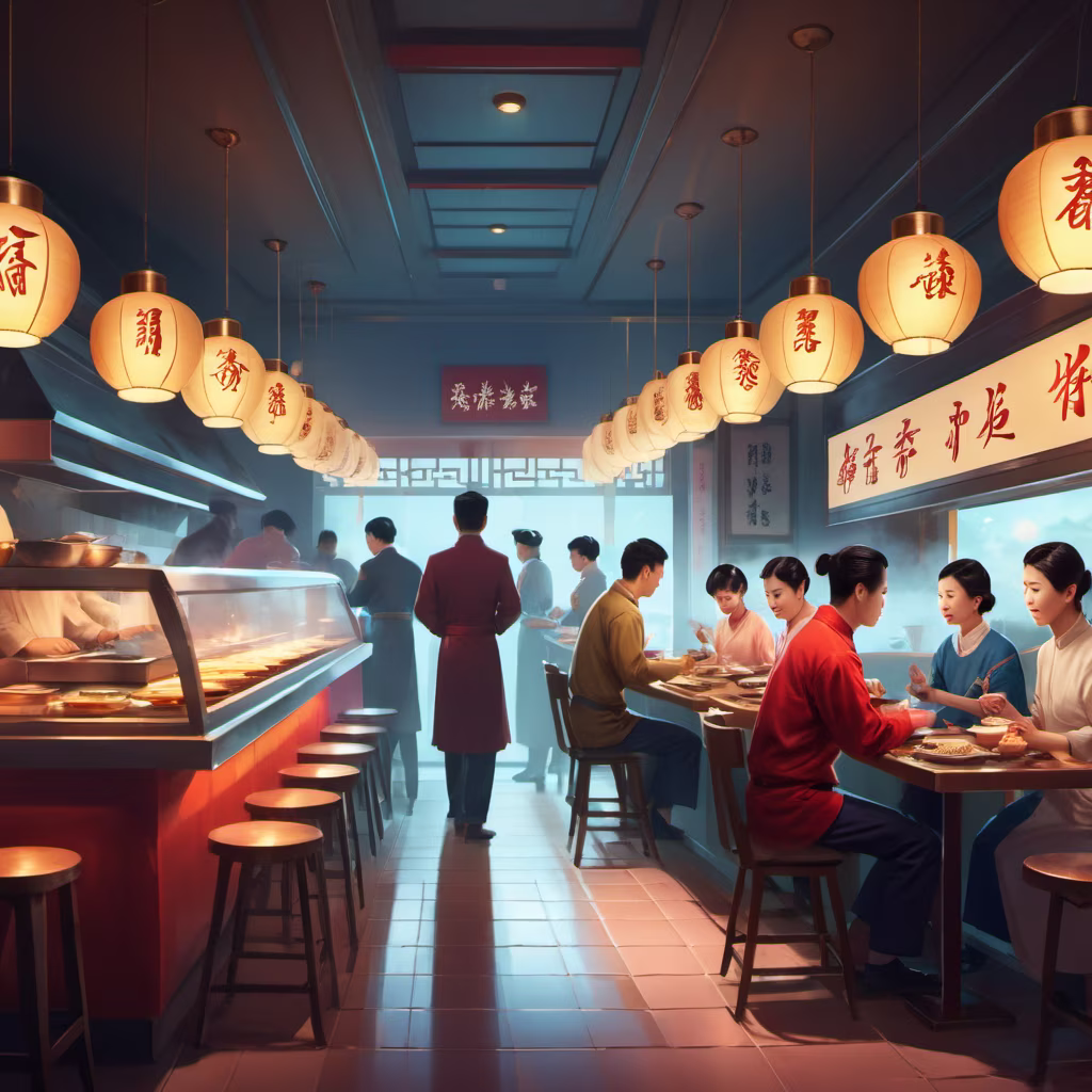 Prompt: The image is chinese resturant,people making food in kitchen,people eating food in restaurant,people wating to oder in line,ronghua,vintage style,modern style,ultra HD picture,panpramic,center the composition,cinematic lighting