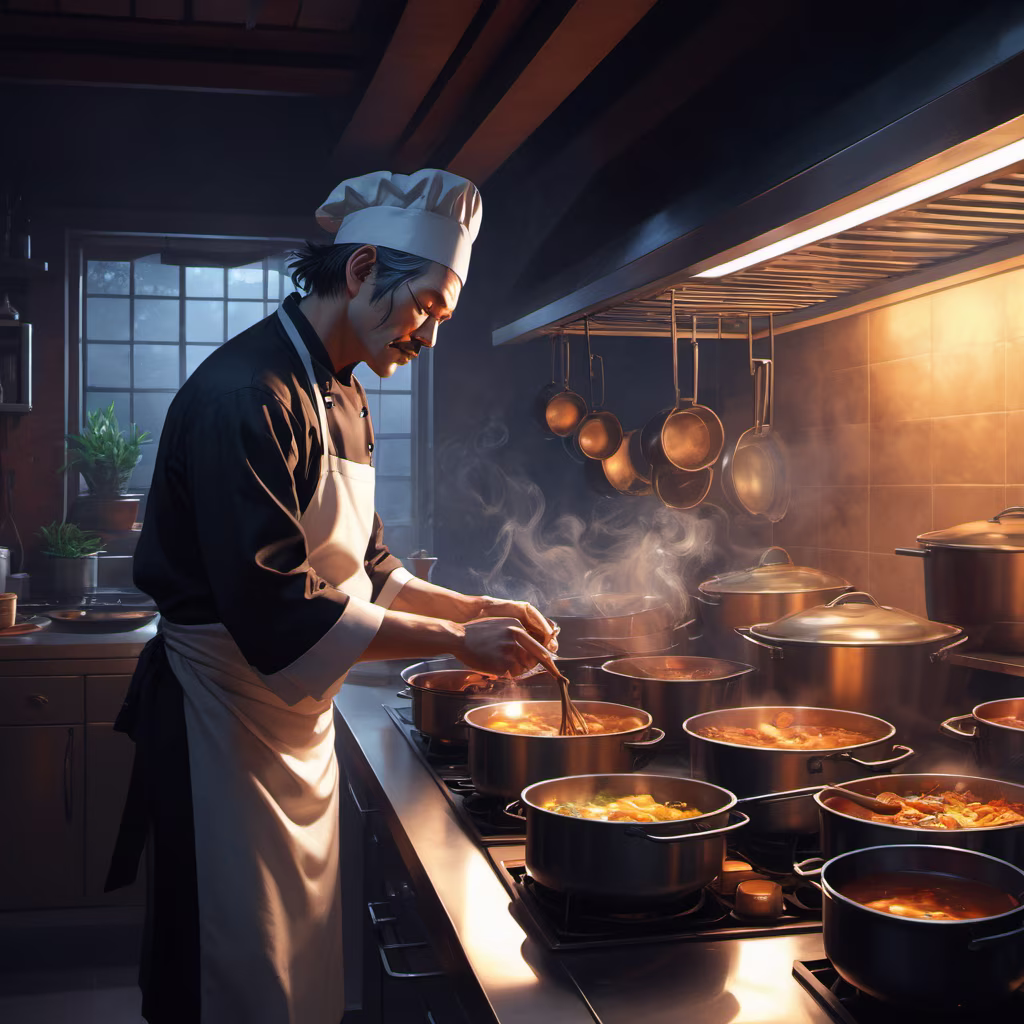 Prompt: At night, in the smoky kitchen, under the dim amber light, the chef carefully adjusts the temperature of each pot of food,Greg Rutkowski lighting, 4K resolution, by Masamune Shirow, Atey Ghailan