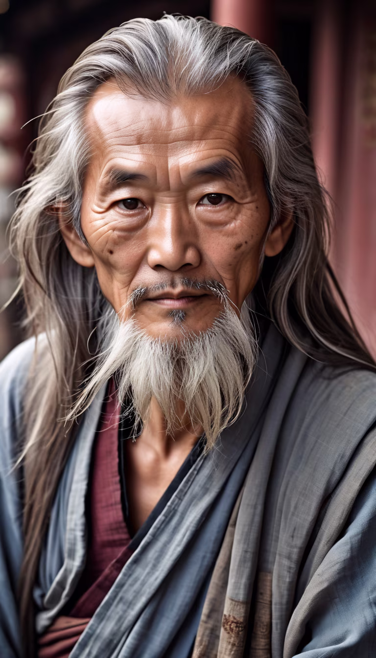Prompt: A wise old man with gray hair, wrinkles all over his face, dark skin, but powerful eyes. A realistic portrait of a real person, half body photo, with a background of mountains and flowing water, wearing a tattered robe and messy long hair. The image of a Chinese person
