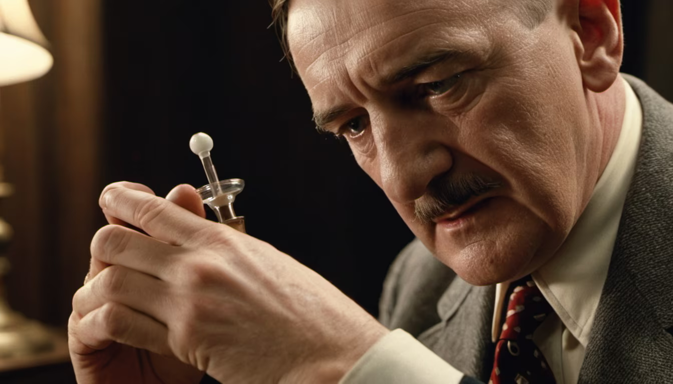 Prompt: In his private quarters, Hitler grips the side of a porcelain sink, staring intensely at his drawn features in the bathroom mirror. With trembling fingers, he raises a small medical device—a miniature pump attached to a thin nasal catheter. Taking a sharp breath, he inserts the catheter’s tip into his right nostril and presses a button. A measured dose of cocaine is released, burning the delicate tissue. Hitler’s eyes water but his face remains set, determined. He gives a curt nod to Morell, ever watchful in the doorway, before replacing the device in its case. Another treatment is complete, and the Führer emerges, riding once more on a man-made wave.