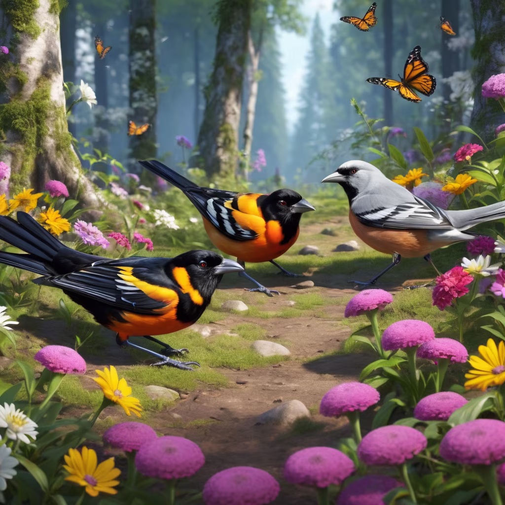 Prompt: 3 gray squirrels on the ground, talking to bullock oriole, vibrant forest with flowers and trees, concept art, highly detailed, 4k