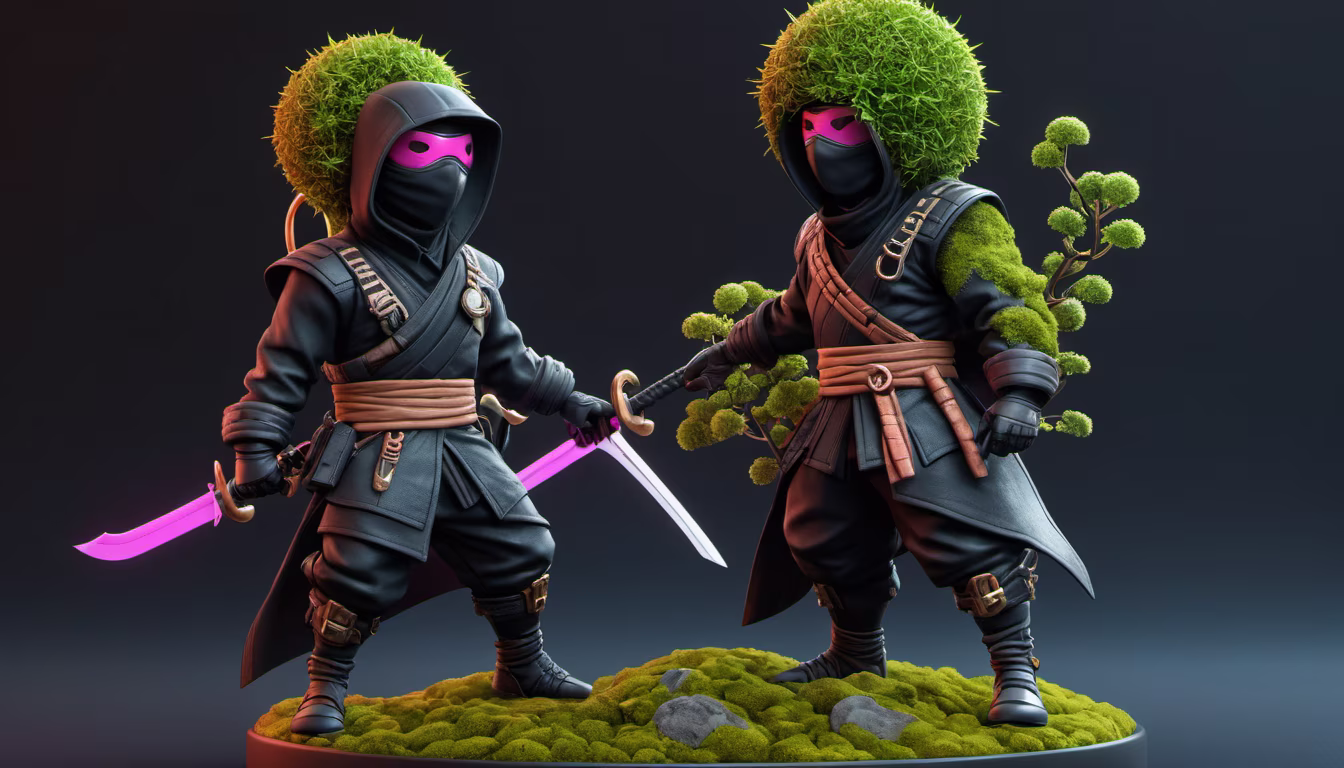 Prompt: cute ninja miniature topiary moss guy fighter hd 3d 32k amazing character design