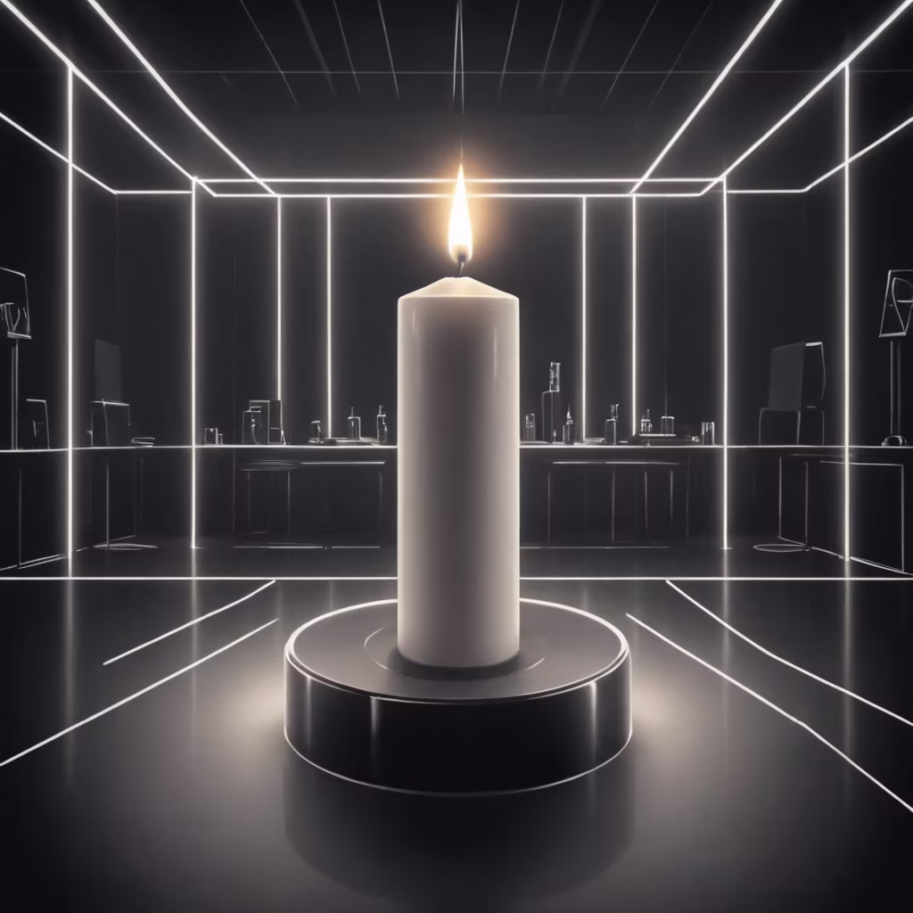 Prompt: a single white candle in the middle of a modern music nightclub, loudspeakers on the background, spotlights are illuminating the white candle, center view, luminous, dramatic, dynamic