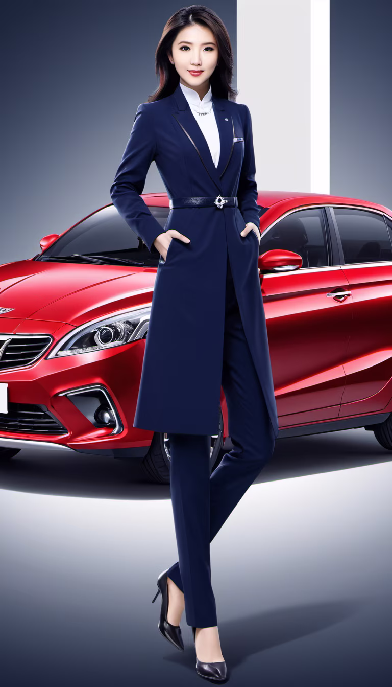 Prompt: Keywords for National Trend (Guochao) Avatar of a 30-year-old Car Sales Consultant: 1. 30-year-old sales champion 2. Smiling and cheerful expression 3. Unique Guochao-style fashionable attire 4. Visible confidence and professionalism 5. Vehicle elements or sales trophies as embellishments 6. Witty and humorous gaze 7. Distinctive hairstyle or hair accessory 8. Pride evident in the smile 9. Details incorporating automotive background or vehicle outlines 10. Avatar design that blends traditional culture with modern elements.