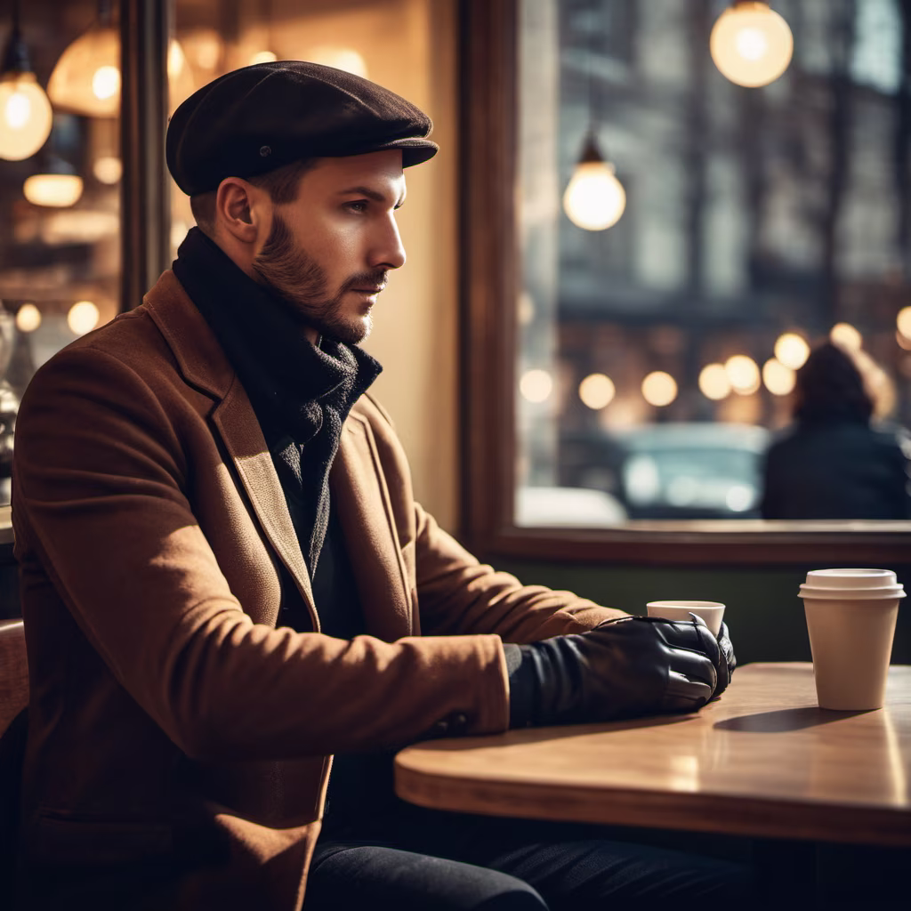 Prompt: man sitting alone in a cafe, winter, shadow, vintage style,photorealistic