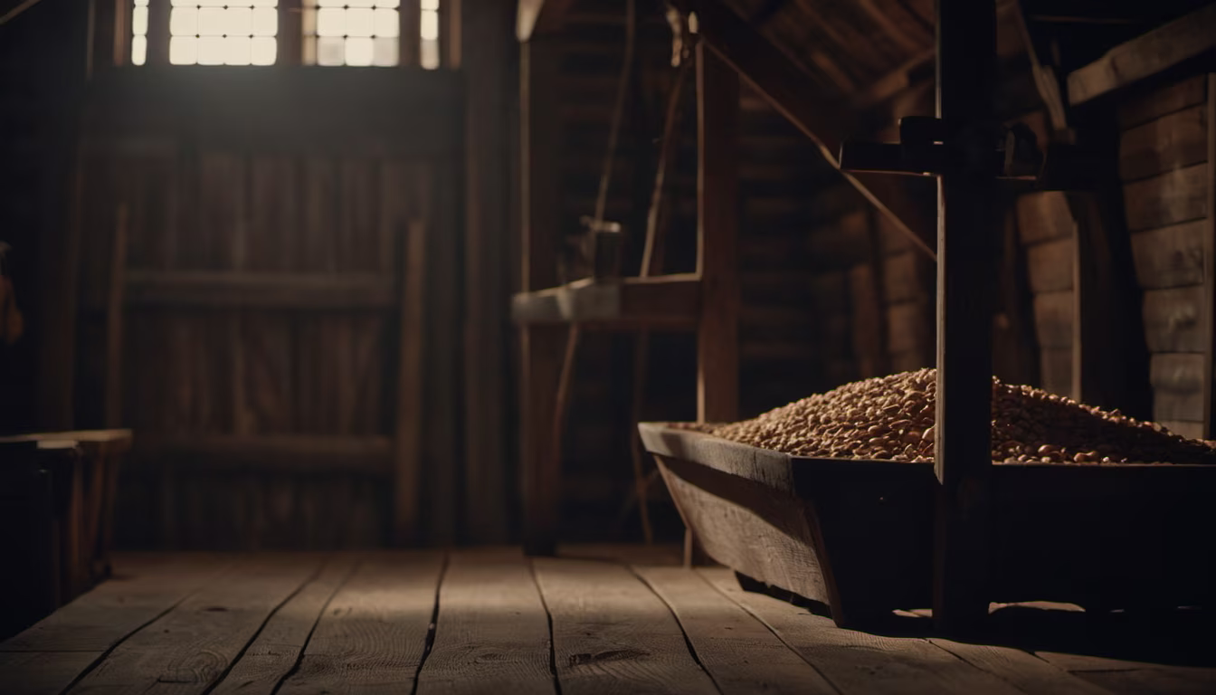 Prompt: 1584, Roanoke Island, old granary with little grain, a few grains rolling around on the floor, open granary, dark atmosphere.