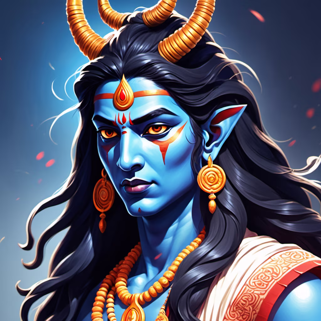 Prompt: Create a captivating Discord thumbnail illustrating the birth of Kali Rakshas influenced by Lord Shiva. Emphasize Shiva's unique powers and the intriguing blend of elements. Make it visually striking to spark engaging discussions