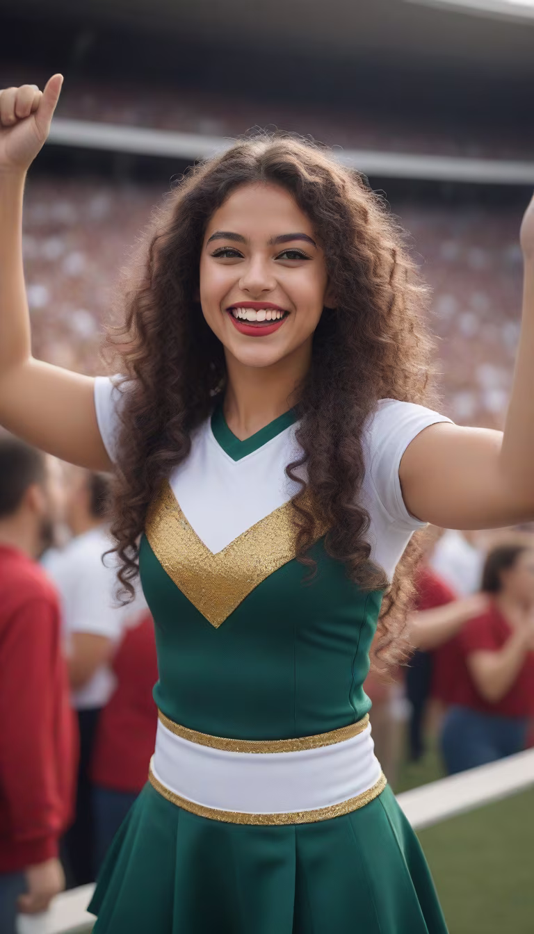 Prompt: Potografy long shot of Lunar Ventura, a 25-year-old Brazilian, with a modern and bohemian style, long curly brown hair, expressive and curious green eyes, well-marked features, well-drawn and fleshy mouth. Luna is made up with red lipstick, well-defined eyes and false eyelashes, smiles, wearing a short red skirt and white toper (cheerleading uniform), with her arms up and pompoms in her hands, in a bleacher of a football stadium, full of people