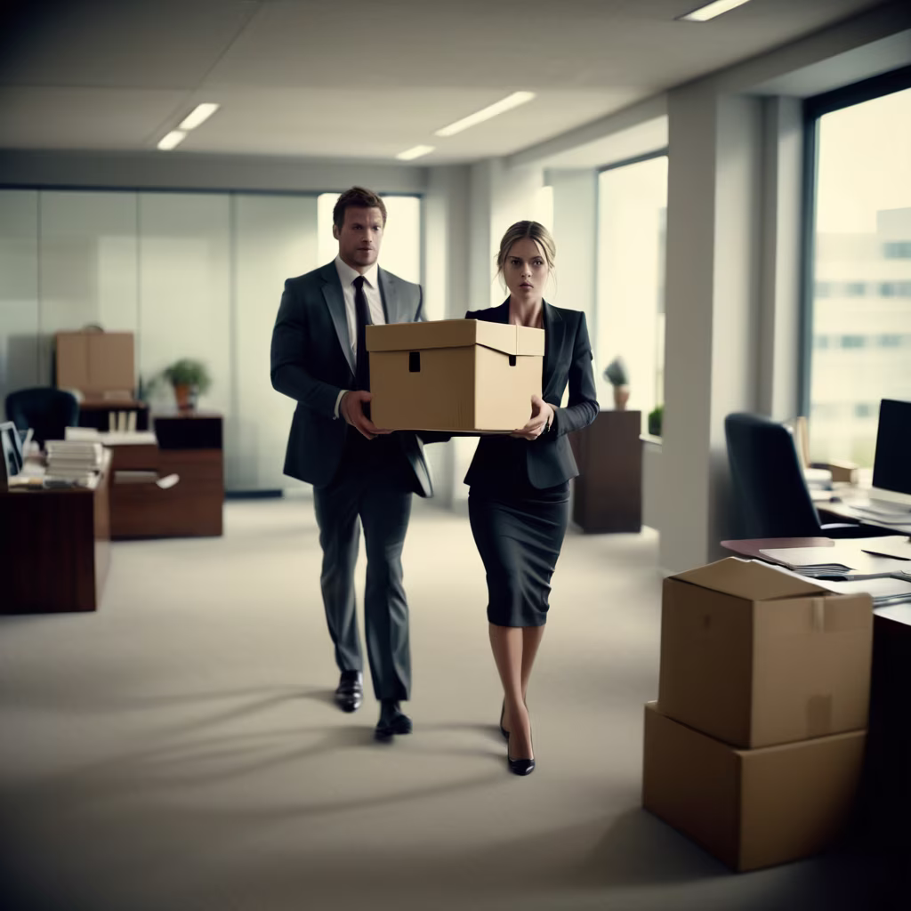 Prompt: foreground is a beautiful woman carrying a box quitting her job and in the background a man looks at her