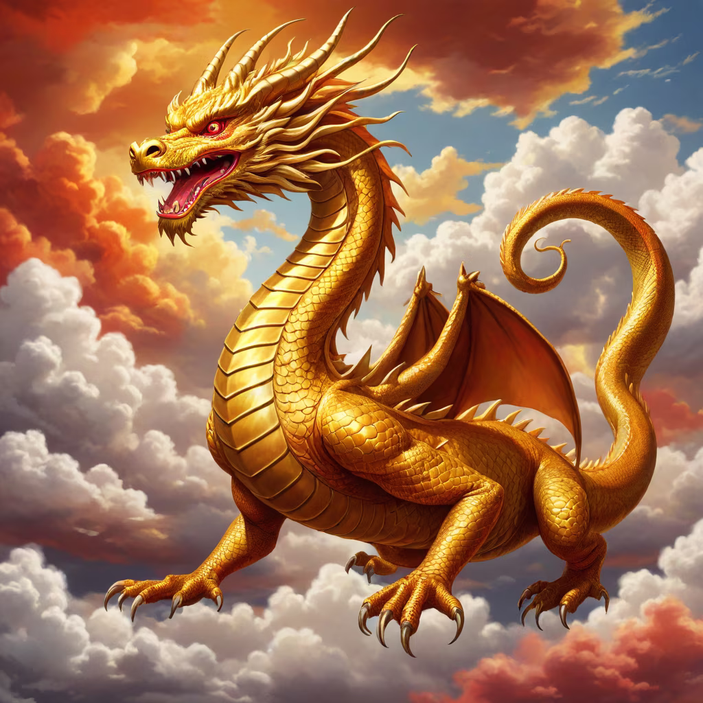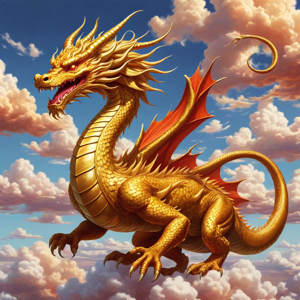 Prompt: Japanese golden dragon, good dragon, dragon in flight, long body wriggles like a snake , 4 legs, dragon turned tail to the viewer, the dragon turns his face to the viewer , warm colors, clouds, full size, high detail, high quality