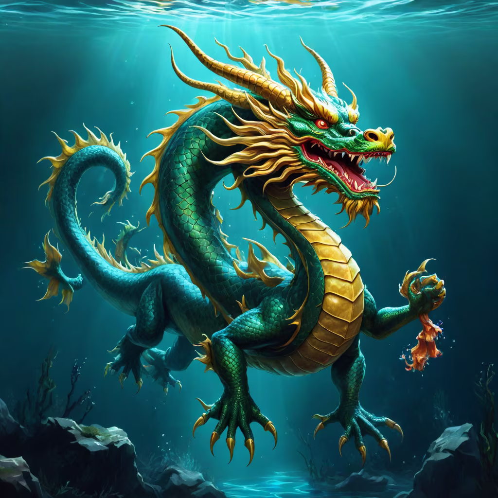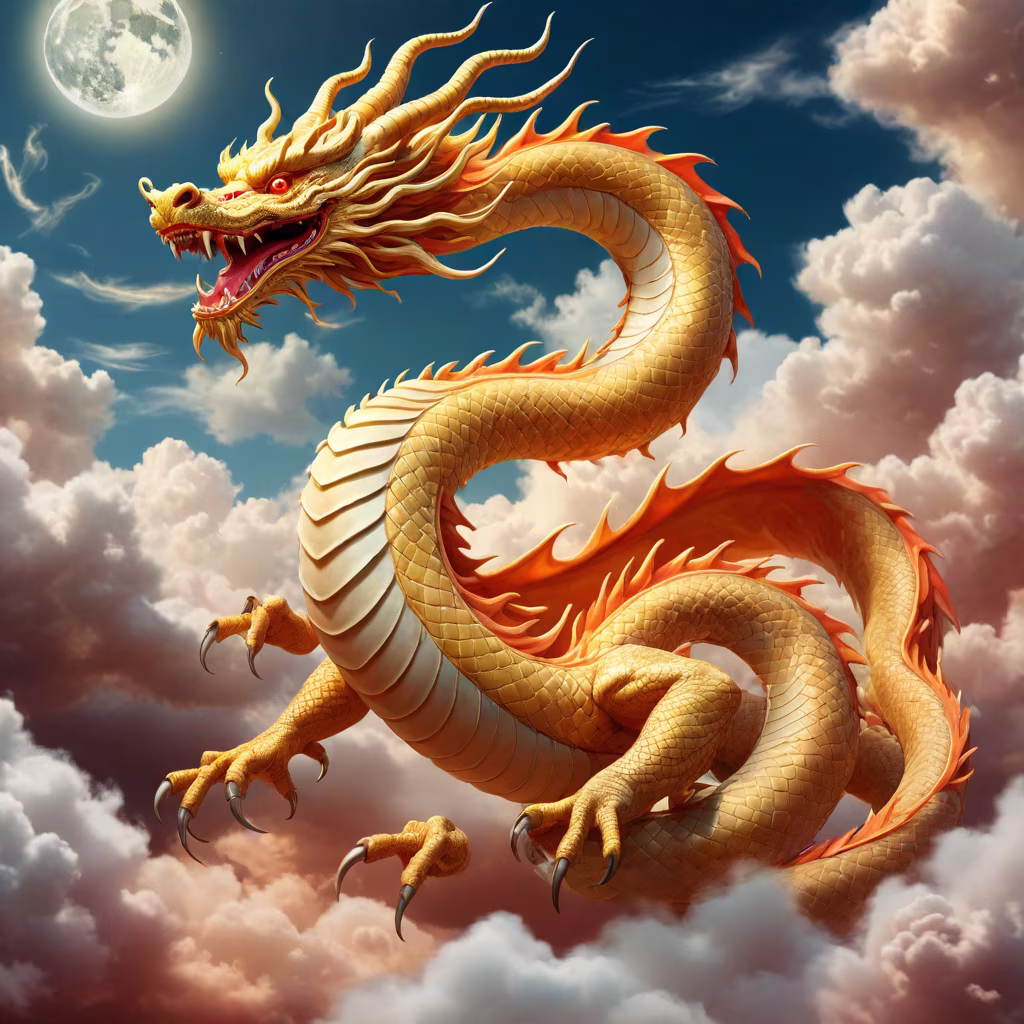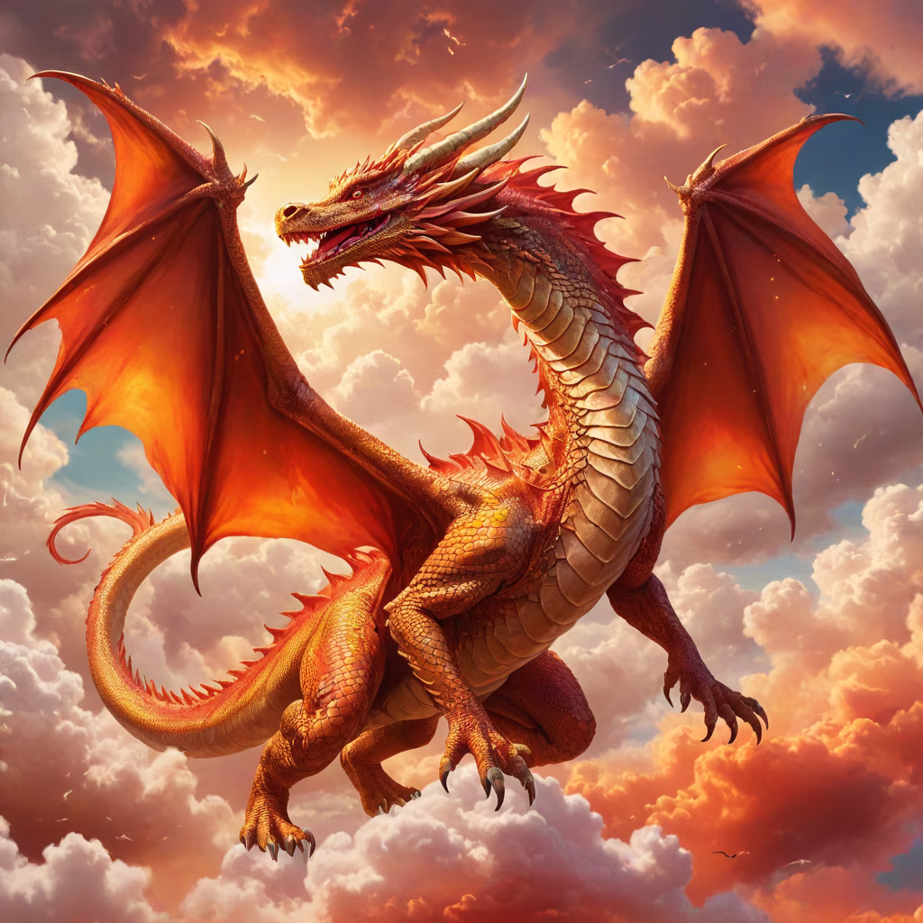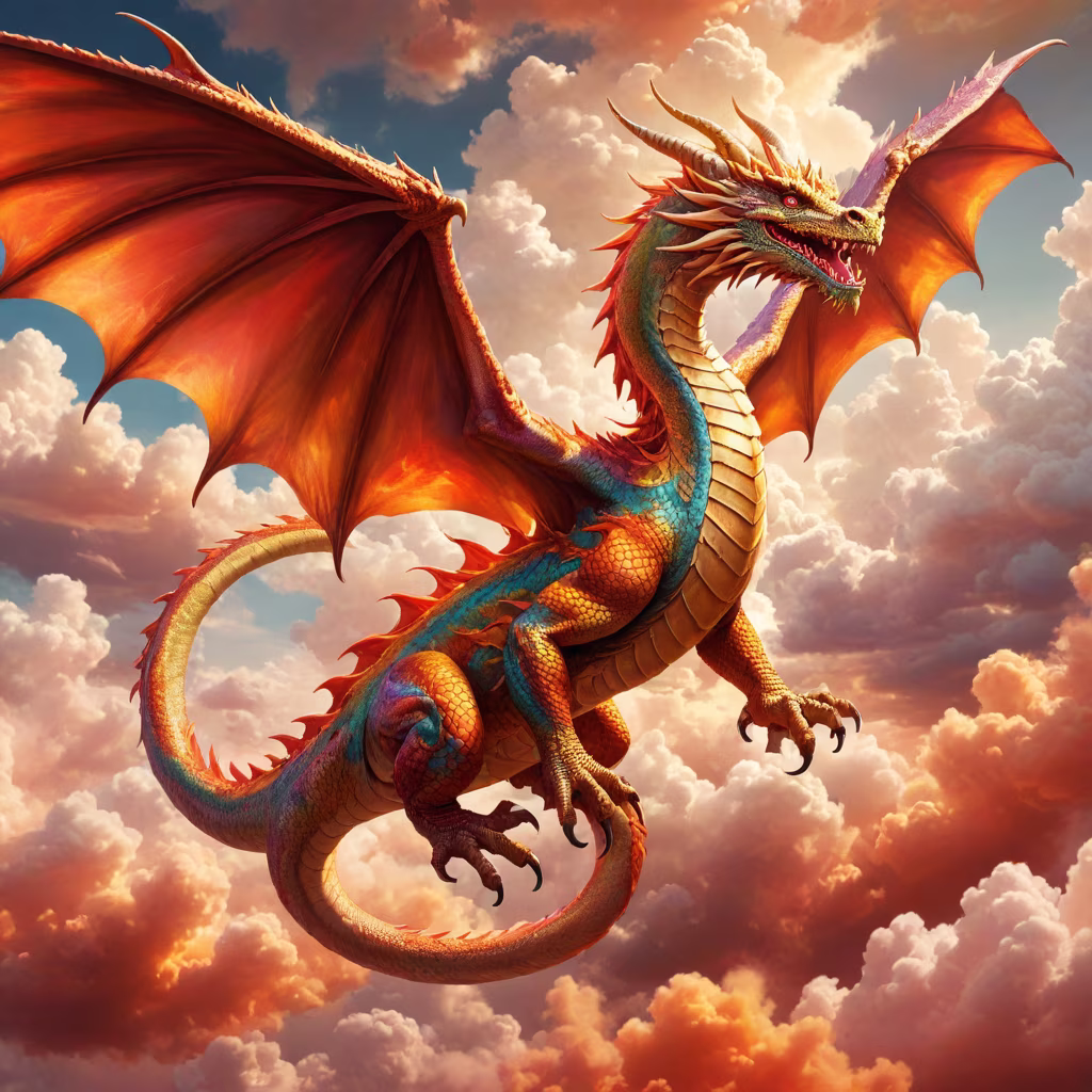 Prompt: Panlun dragon in flying, clouds, warm colours, high details, high quality