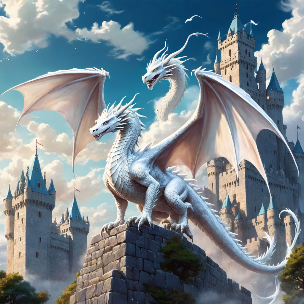 Prompt: A white dragon, like in Miyazaki's \"Ghost Gone\" anime, flies around the castle, the castle wraps around the dragon's body