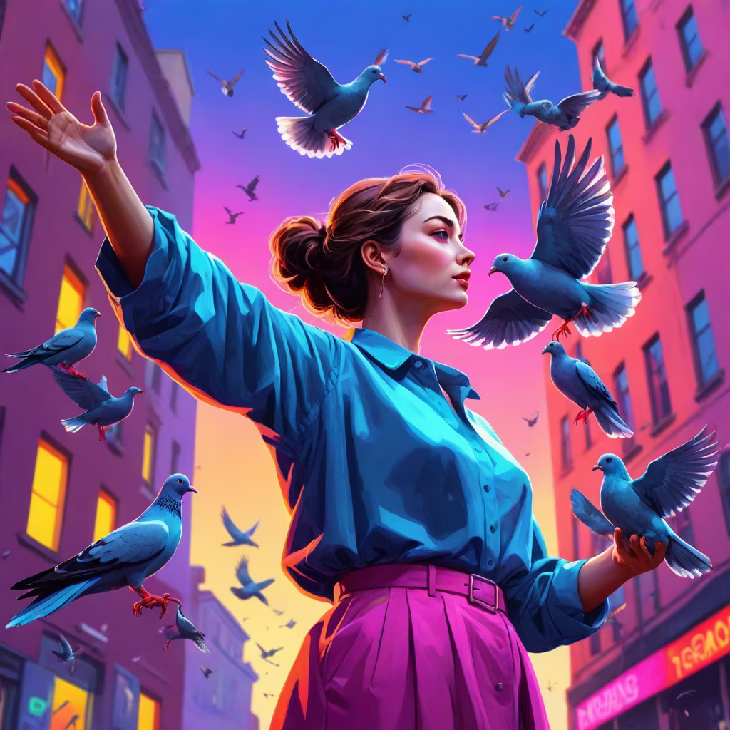Prompt: The woman stands with her back to the viewer, stretches her hand to the sky, pigeons fly in the sky, one of the pigeons in its beak carries a twig to the woman's hand, close angle, neon colors