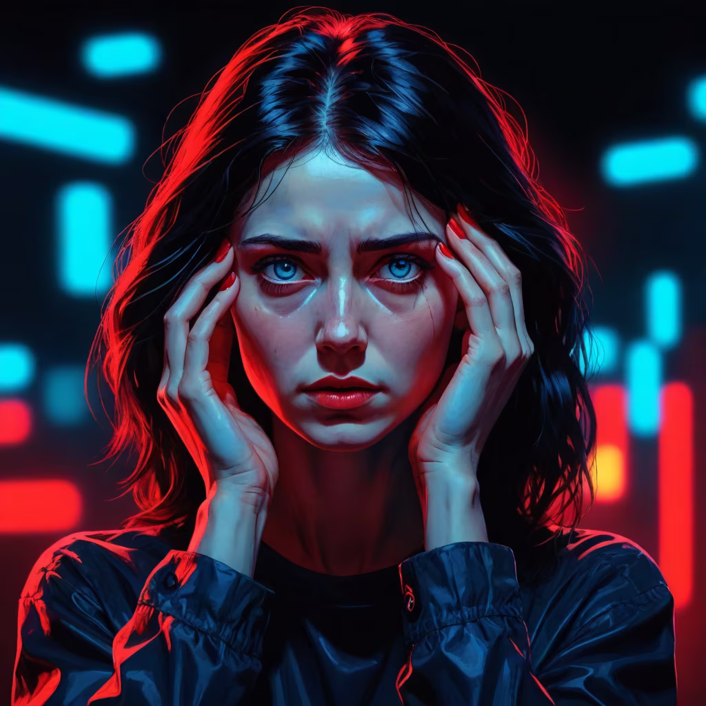 Prompt: Sad woman put her hands on her head,emotion of powerlessness, beautiful woman, blue eyes, dark hair, in the background dark silhouettes of people with red eyes, neon colors