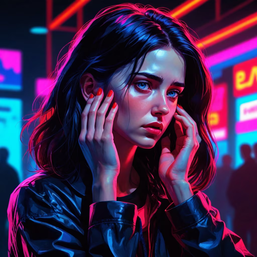 Prompt: Sad woman grabbing her head, beautiful woman, blue eyes, dark hair, in the background dark silhouettes of people with red eyes, neon colors