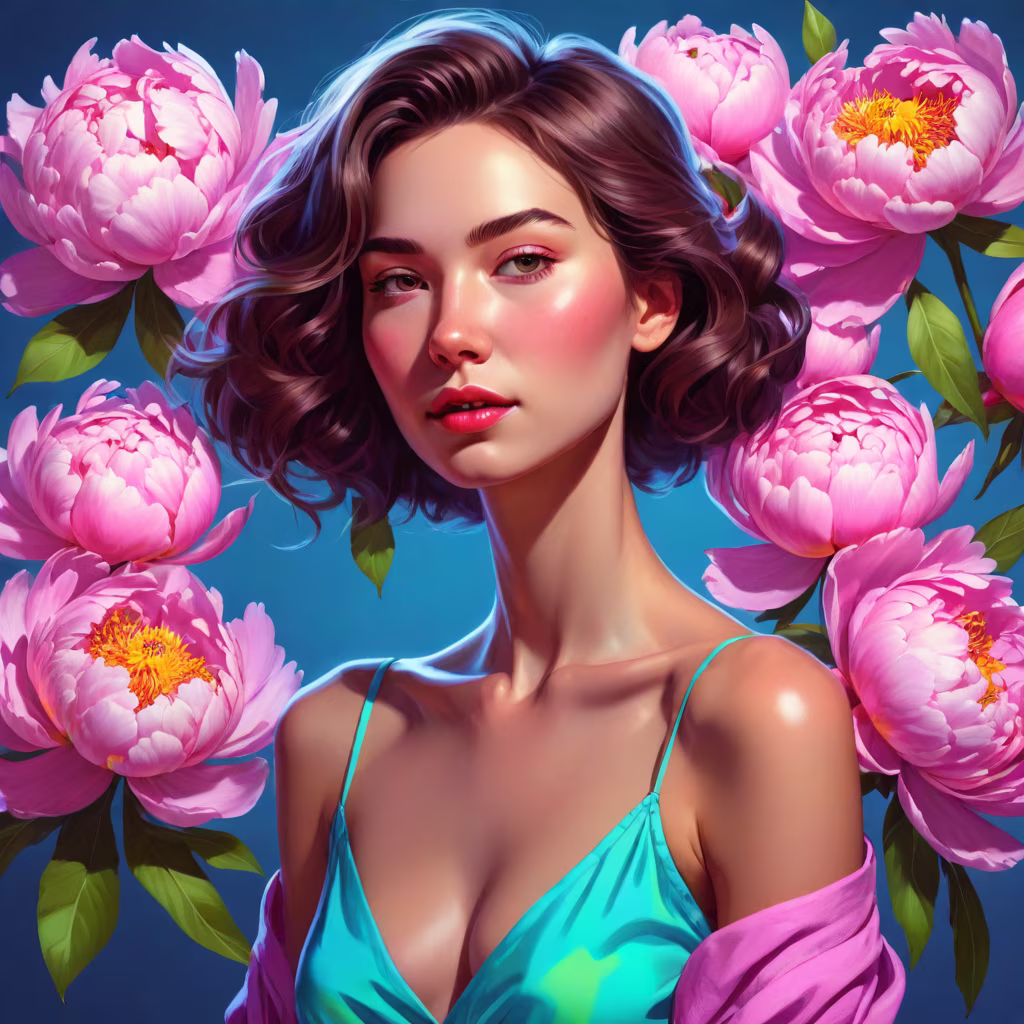 Prompt: Beautiful woman in 3/4, hair developing, slight smile on her face, eyes closed, bare shoulders, peonies blooming on the woman's chest, waist-length portrait, neon colors