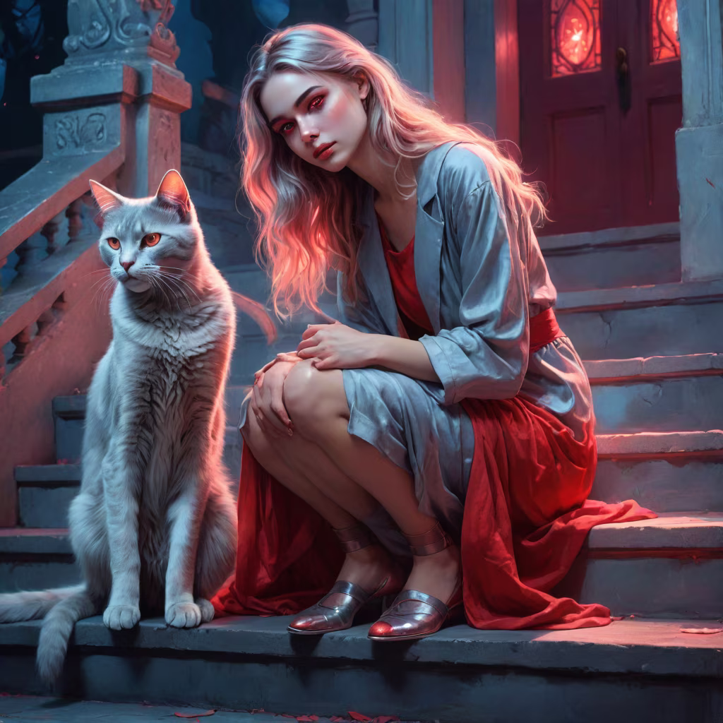 Prompt: A beautiful woman is squatting, hugging her knees, the woman is sitting on a step, and on the other steps are sitting gray cats with red eyes, neon colors