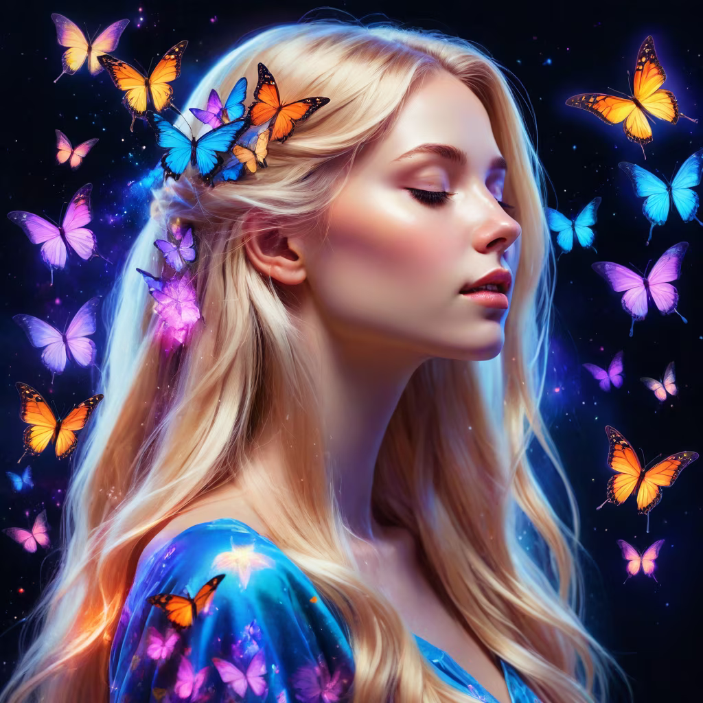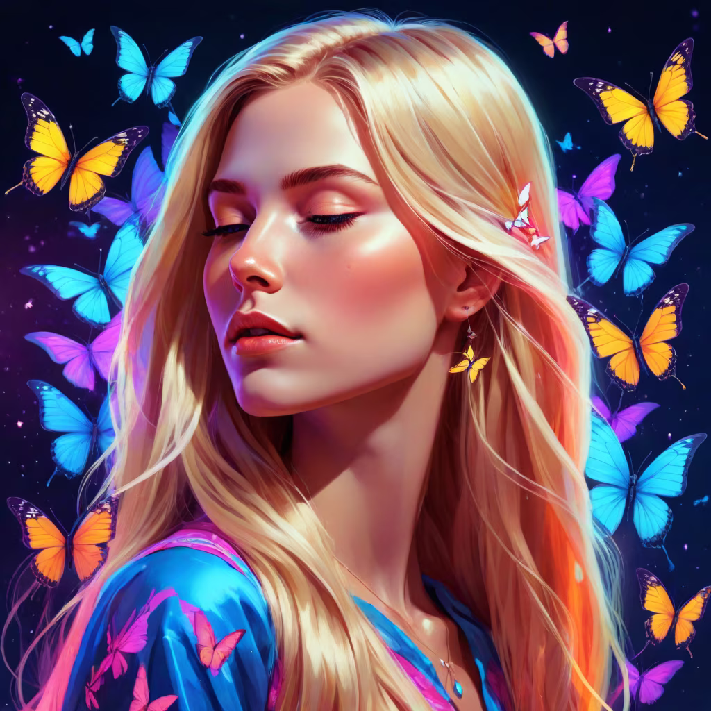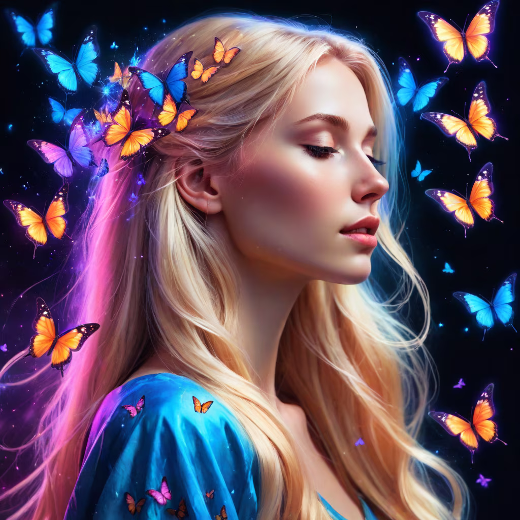 Prompt: Beautiful woman in profile, long blonde hair, straight hair, many beautiful butterflies around the woman, the genie has closed eyes and a slight smile on her face, the emotion of harmony, portrait across the chest, neon colors