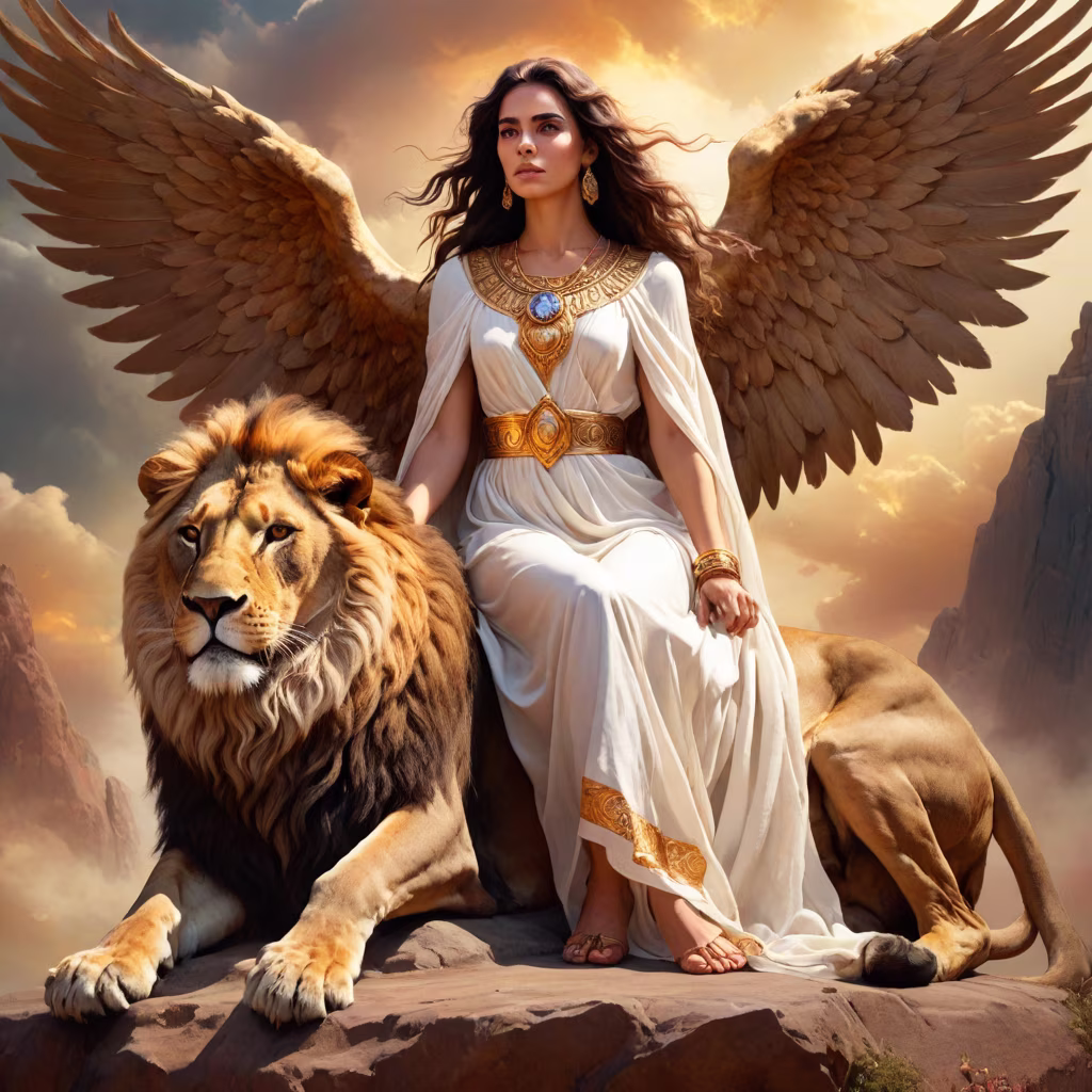 Prompt: Woman sitting on a lion, lion standing, woman with dark hair, white Greek dress, lion has gold bracelets on its paws, lion has wings, spread wings, rocks, warm colors