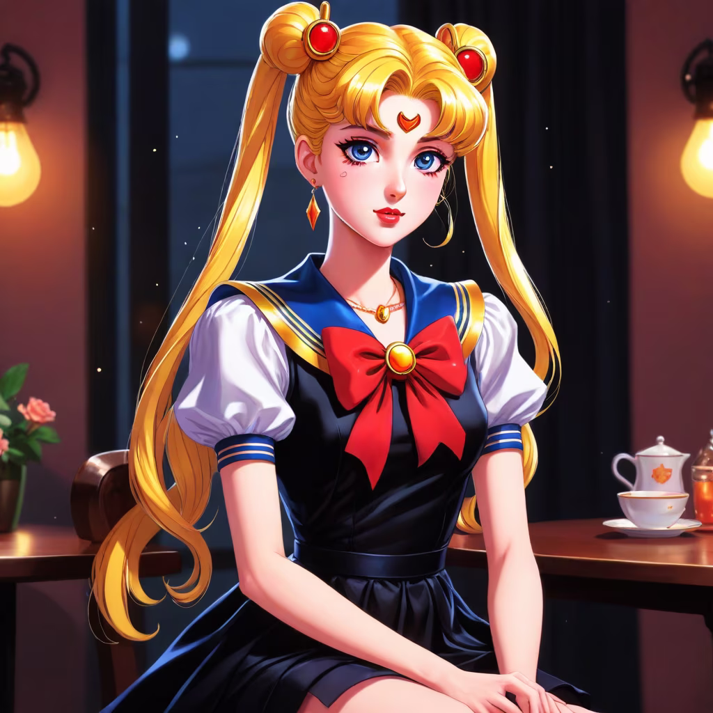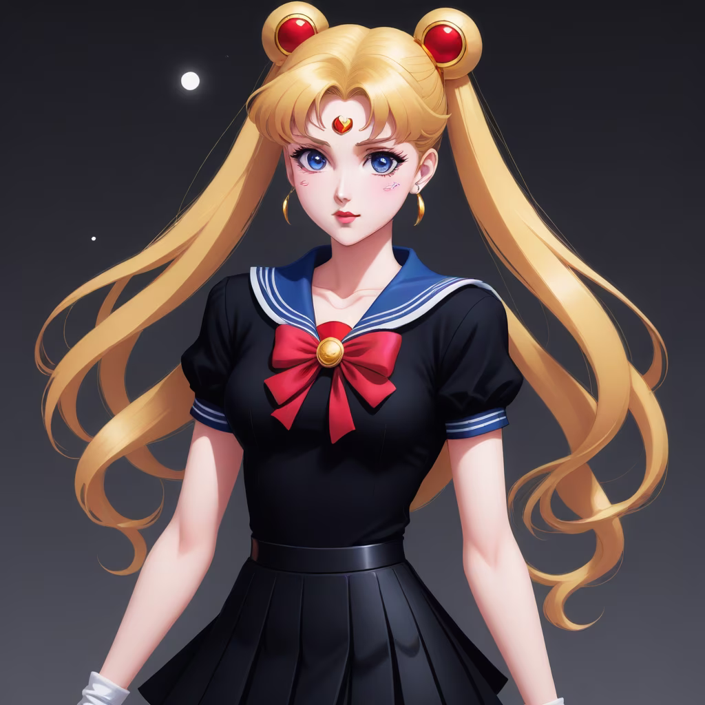 Prompt: Sailor Moon standing in black top and short black skirt, close angle, high detail