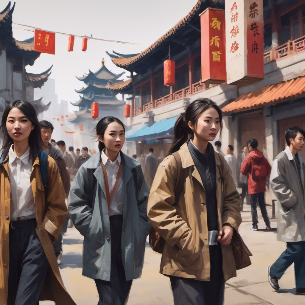 Prompt: A contemporary Chinese city or town scene with several people together. in style of the Central Academy of Fine Arts students' work, with bold and special composition and rough brushwork.