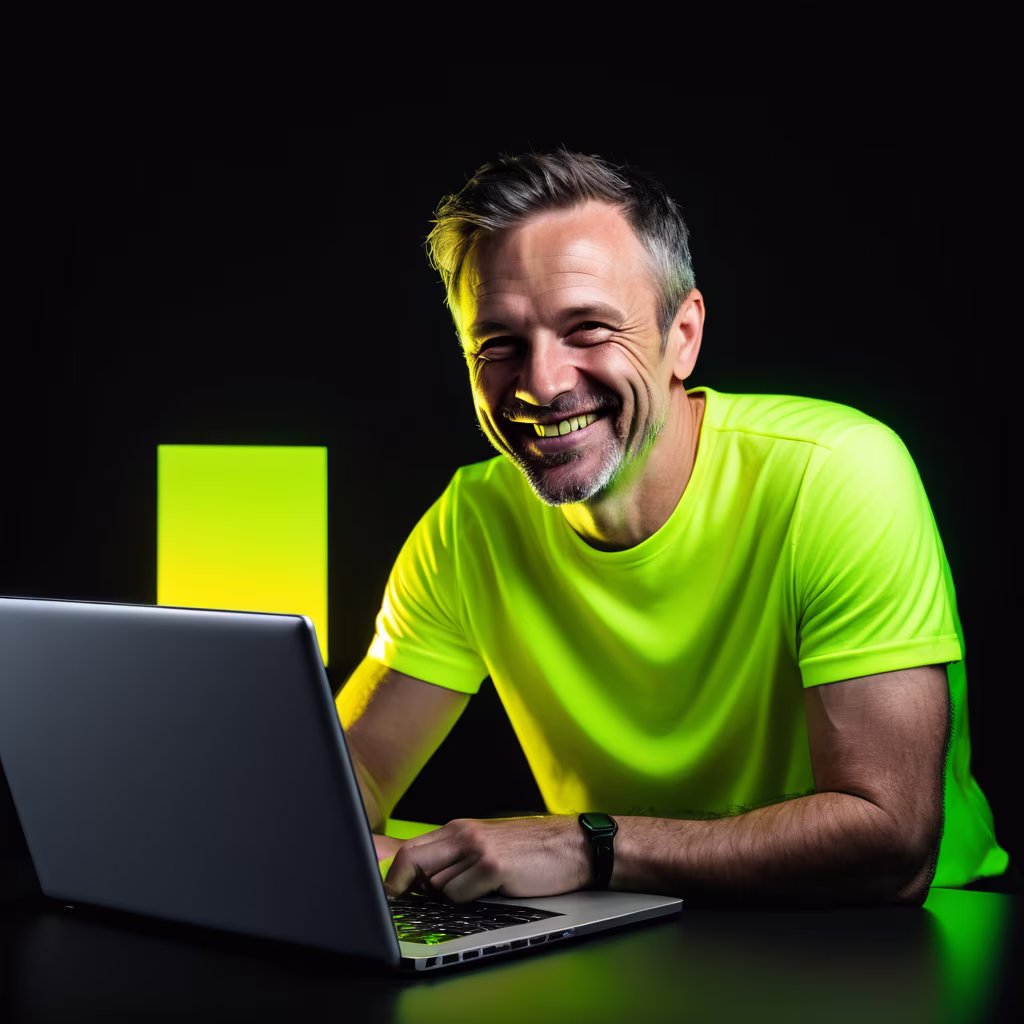 Prompt: a portrait of a 40-50 years old man smiling with a laptop, black background studio, in the style of a promotional photo, neon yellow light