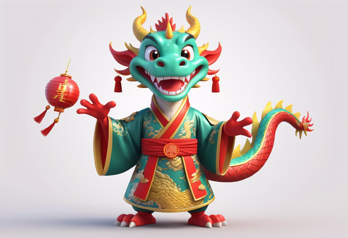 Prompt: A cartoon IP image of a Chinese dragon, anthropomorphic design, wearing clothes, Hanfu, 3D cartoon style, cute, smiling, festive, white background