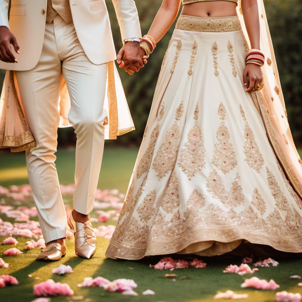 Prompt: waist down, center alligned shot of a beautiful bride in her indian wedding with groom ,bride wearing pastel beige lehenga and groom in a white suit, flowers in the background, flowers on the ground laying, lightily saturated filter, daytime,golden hour, outdoor setting, indian wedding, cinematic lighting, bokeh effect , in the style of the wedding fellas style