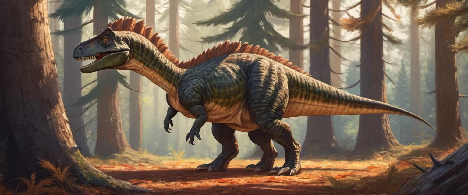 Prompt: Small coelurosaur dinosaur, feathered tail, forest backdrop, pine trees, dappled sunlight, inspired by Mark Witton, Gregory S Paul, Luis Rey, John Conway, paleoart style, digital painting, fine brushwork, warm autumn tones, textured bark, loose brushstrokes, ambient light, scenic landscape, 16K masterpiece.