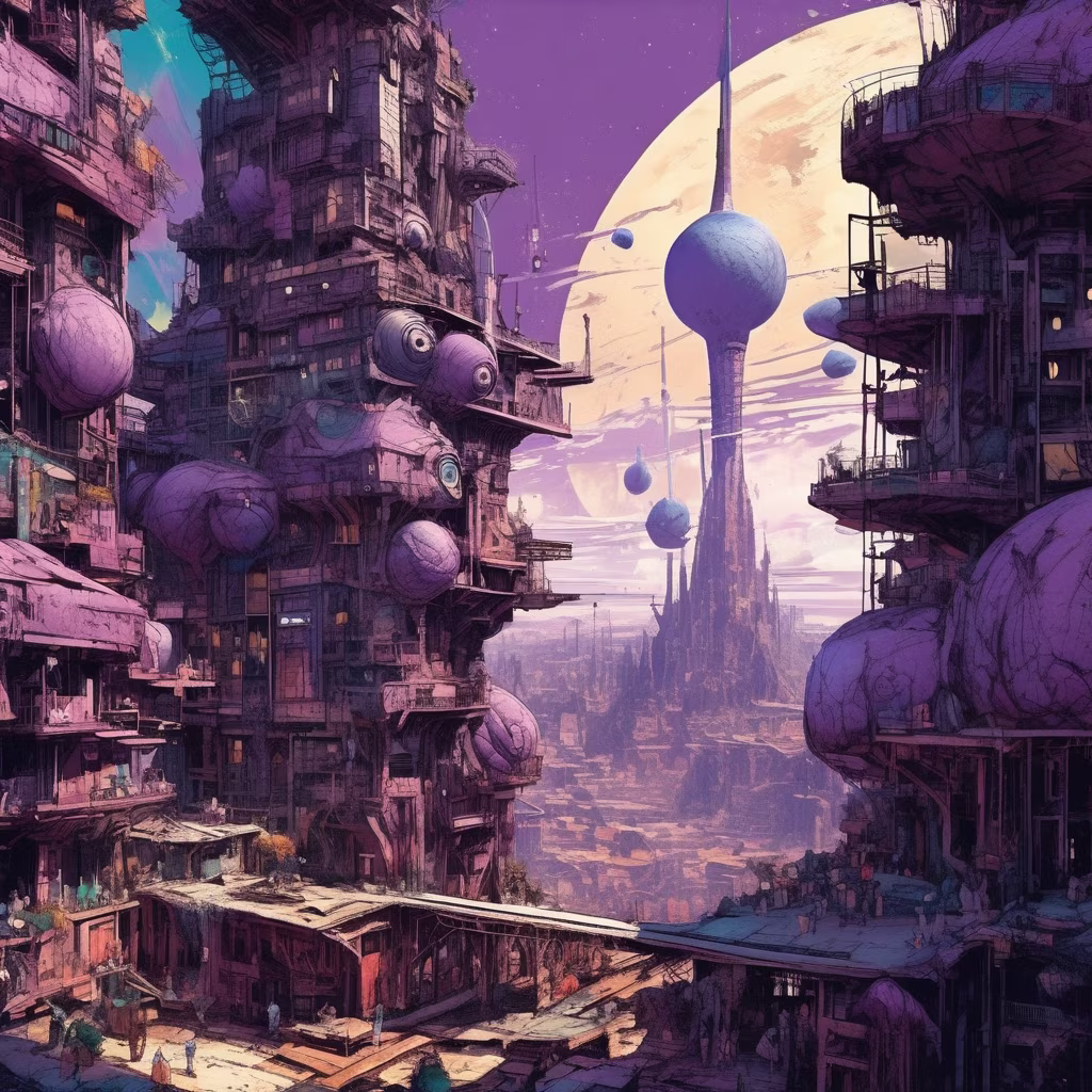 Prompt: william stout style exoplanet forest civilization, graphic novel art by enki bilal, a vibrant turquoise and purple forest, a sky line of dystopian skyscrapers in the long dtstnace.