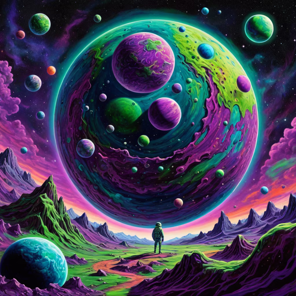 Prompt: surreal planet universe, in the style of psychedelic illustration, spacecore, mixed media chaos, moody color schemes, bold lettering, alan bean, violet and green