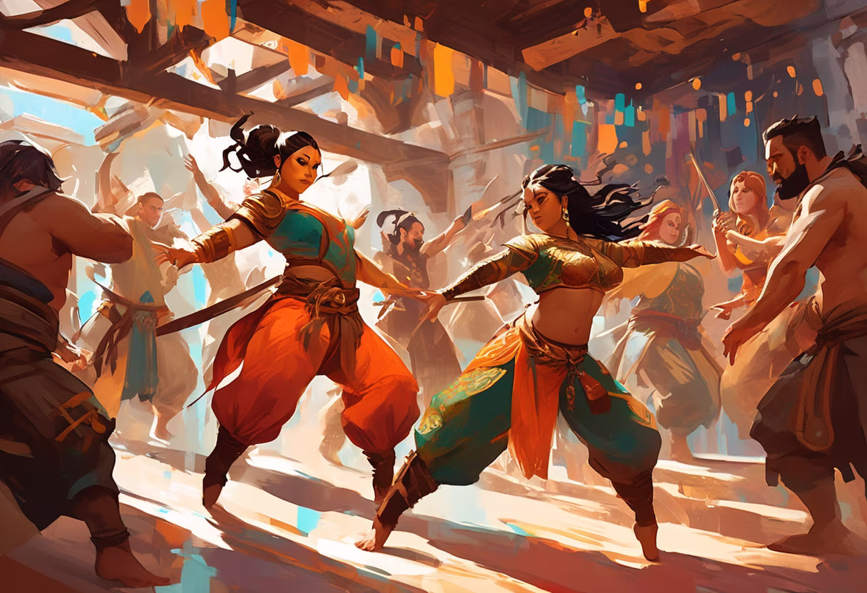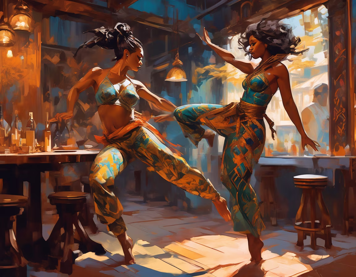Prompt: painting of powerful kick. curvy elf kickboxer knocking out a medieval strongman in a medieval tavern. Action pose. colorful patterned silk pants. artwork by ashley wood, alphonse mucha, mitch byrd and laurie greasley. [gwent cinematic character portrait] powerful victorious woman. roundhouse kick. long dark braids. Afro gymnast lady vs bearded thug. tempura.