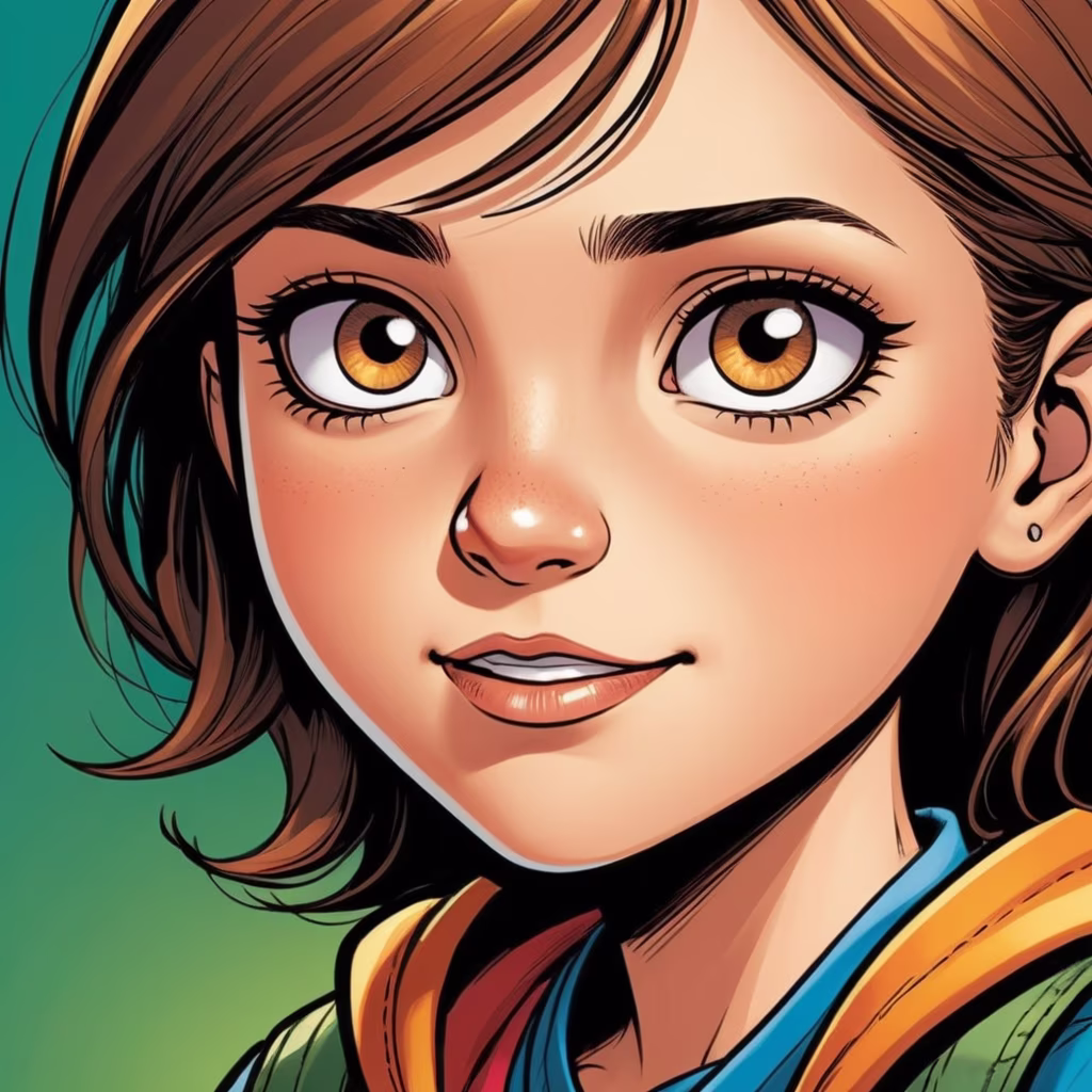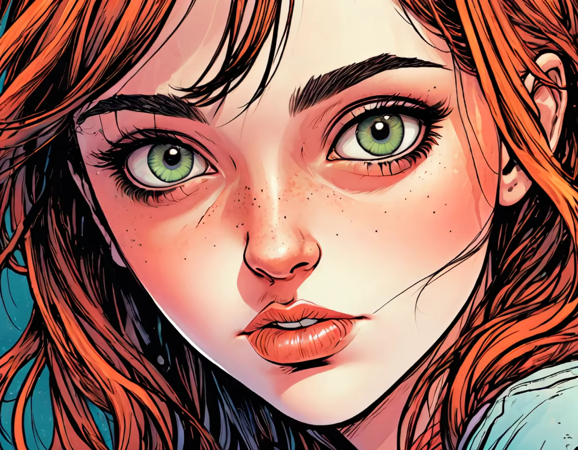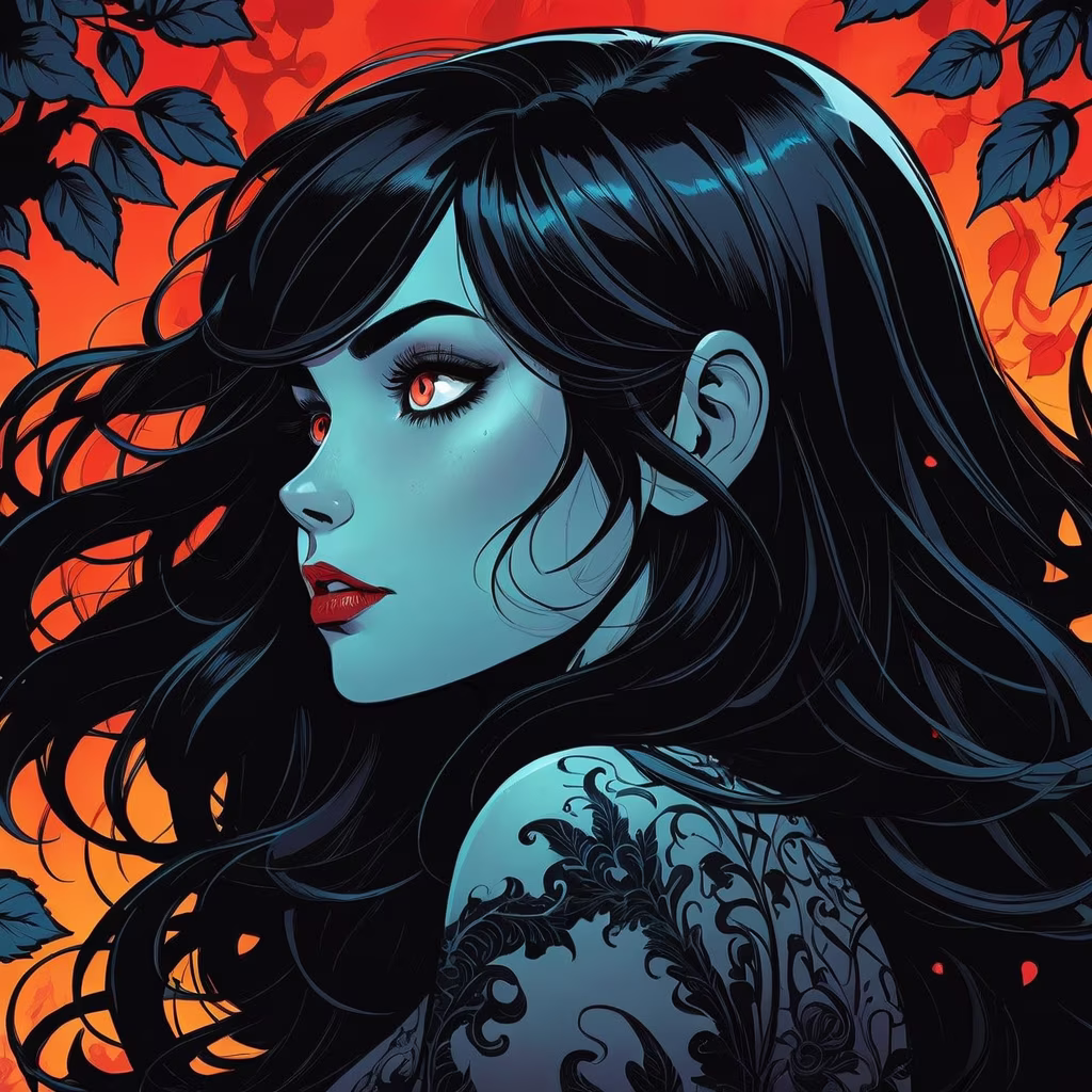 Prompt: sticker of a she-devil who looks complacent, has green eyes and curly black hair`Style: `Comic Book`