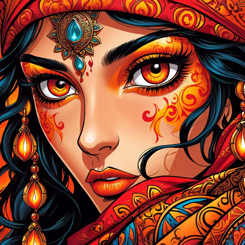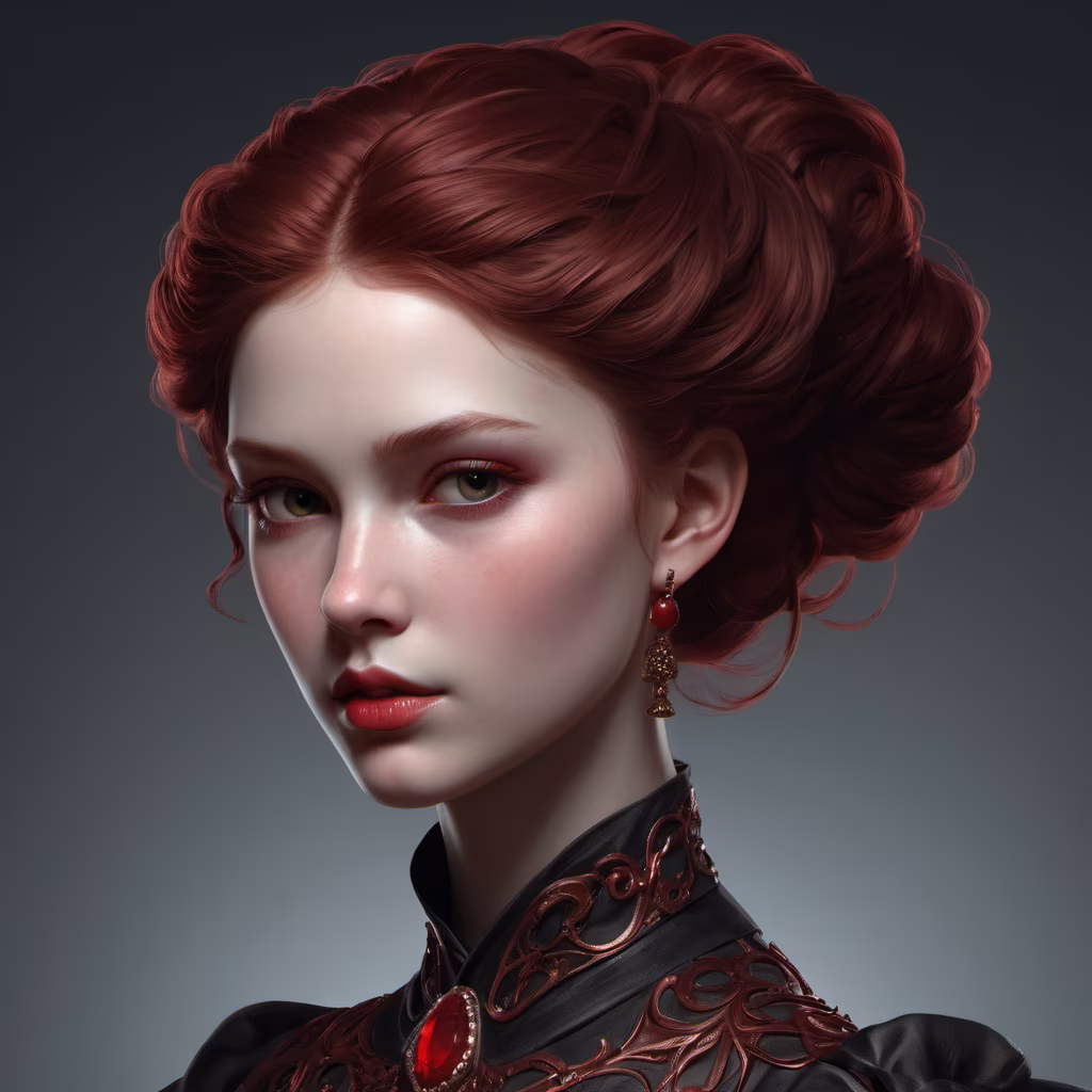 Prompt: A slender, girlish figure. Her face was oval and beautiful in the extreme, her every feature was finely chiseled and exquisite, her eyes large and lustrous and her head surmounted by a mass of coal black, waving hair, caught loosely into a strange yet becoming coiffure. Her skin was of a light reddish copper color, against which the crimson glow of her cheeks and the ruby of her beautifully molded lips shone with a strangely enhancing effect. Wearing only a few highly wrought ornaments and nothing else.