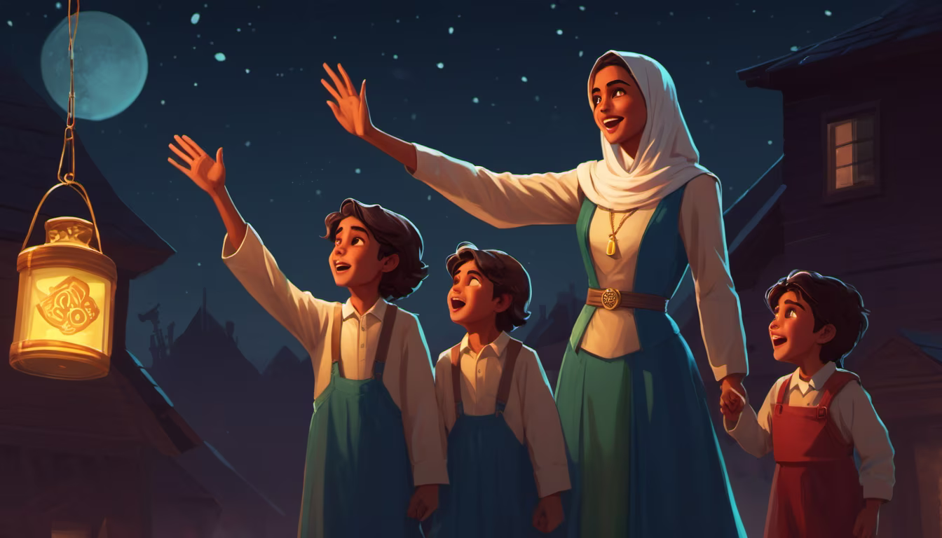 Prompt: \\\"mother bilqees is waving a one thousand crrency not in the air, her three children are standing next to her, reciveing for money, at home, night, \"/