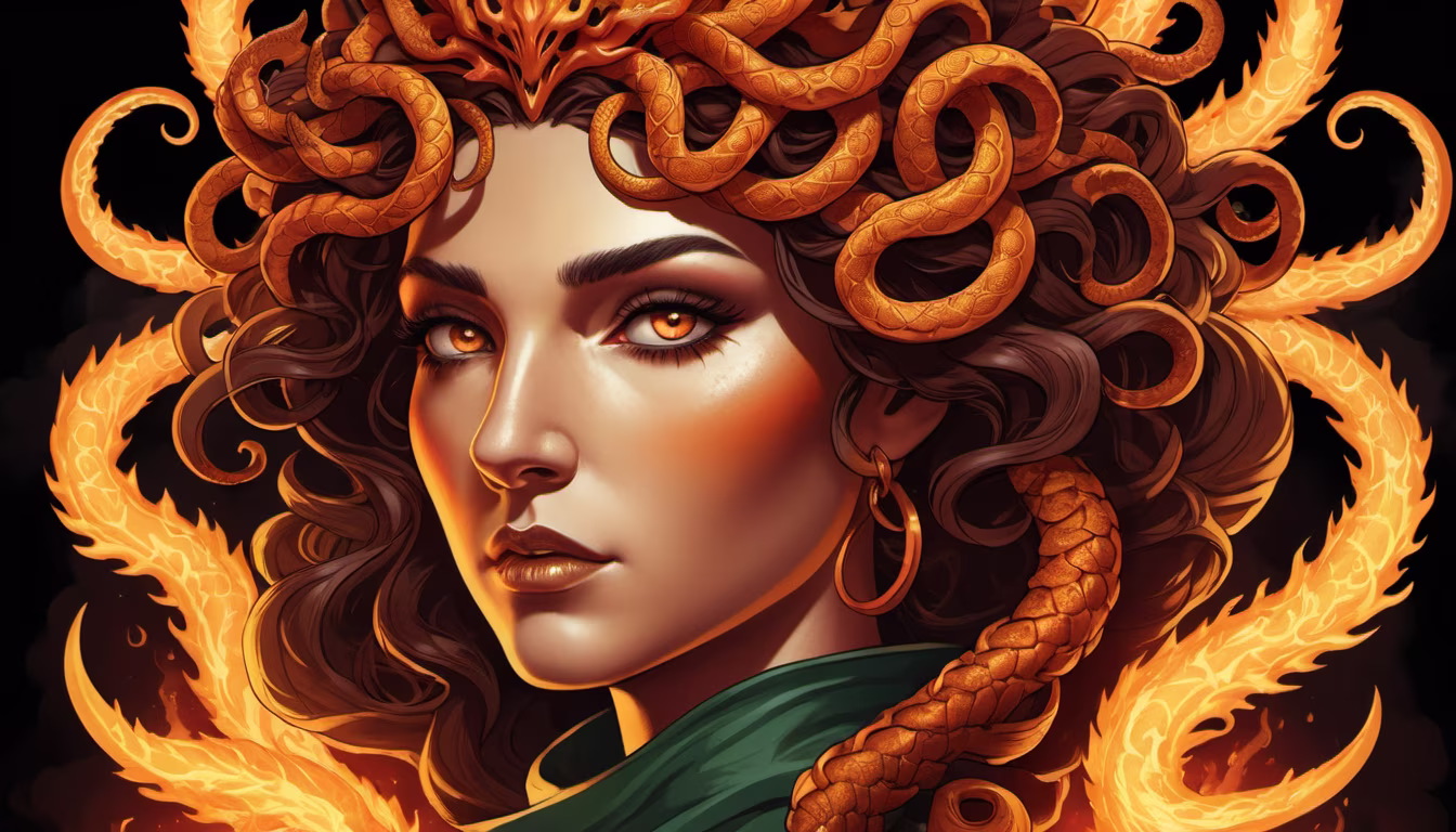 Prompt: A portrait of the face of medusa, small half/part of her face is burning with flames fire smoke, 16K high resolution, ultra detailed, ultra shapren, high-quality image