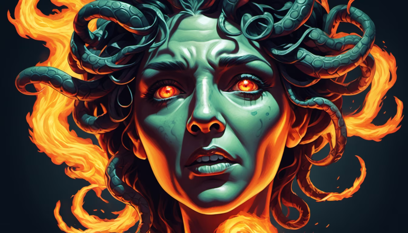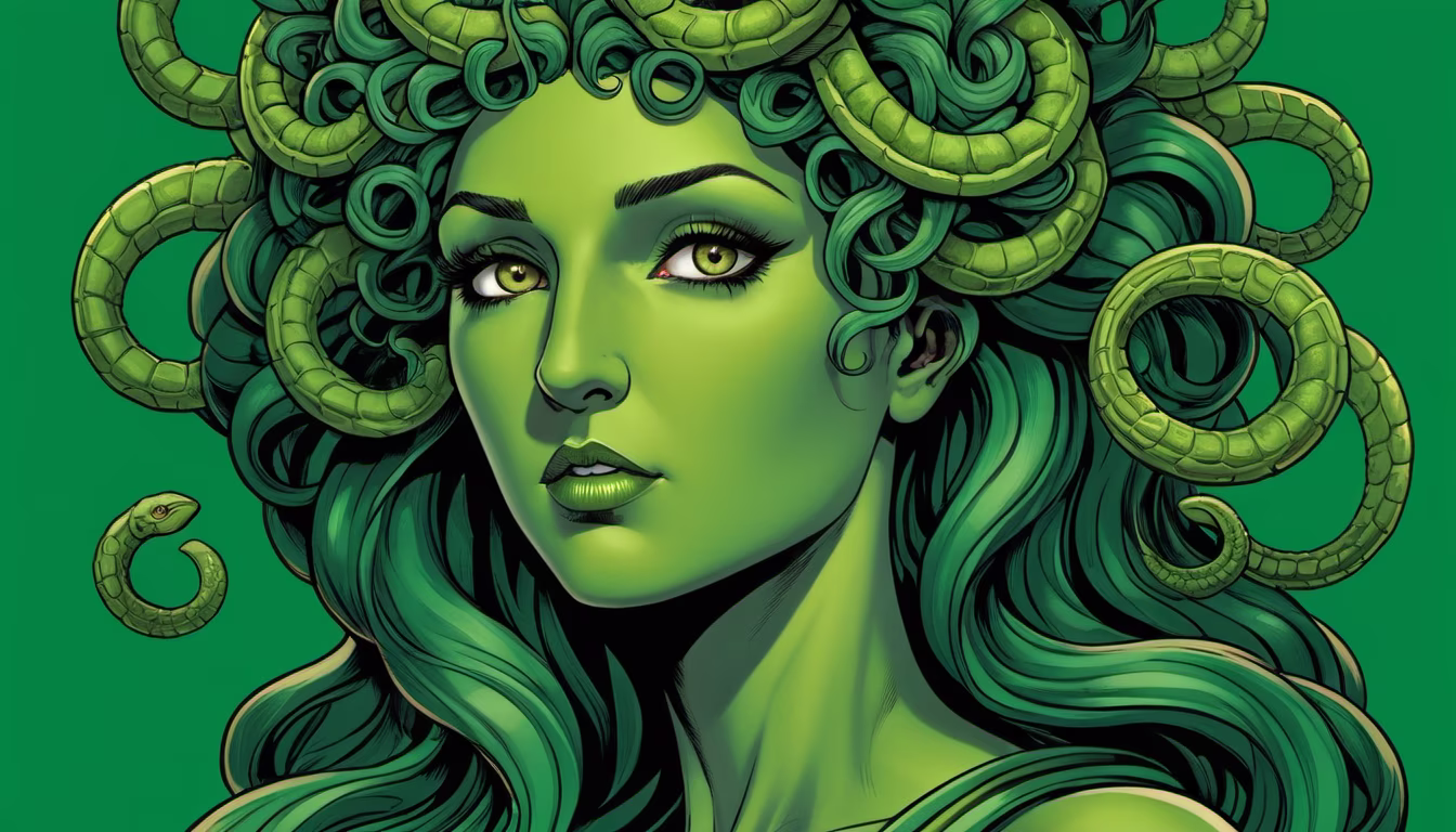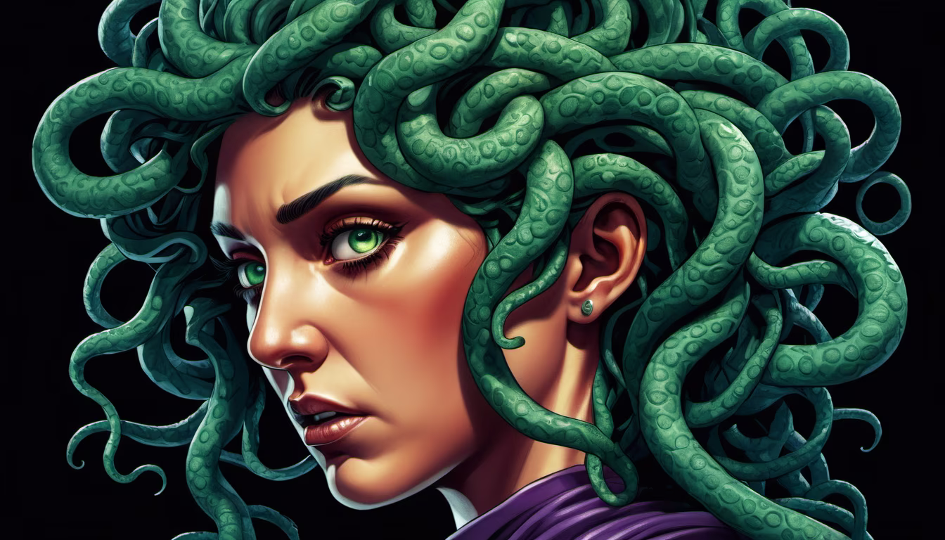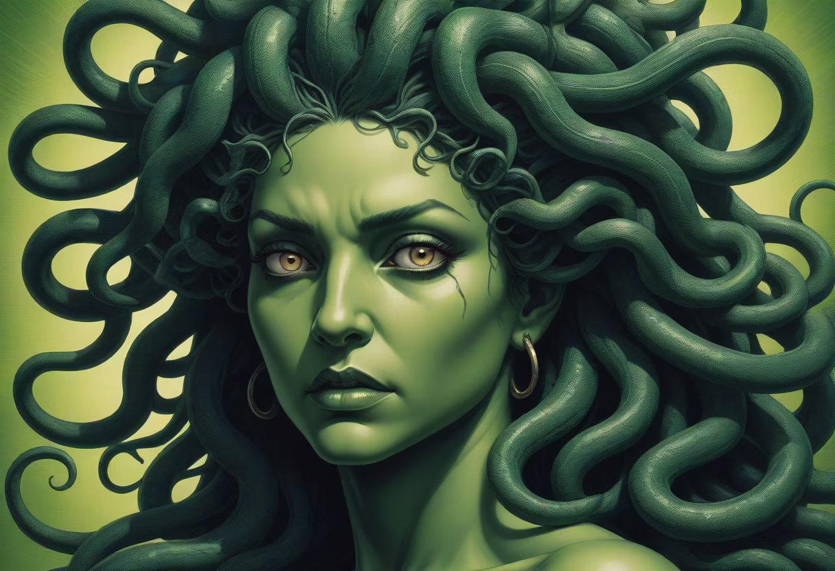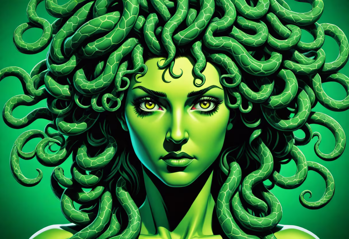 Prompt: Portrait of Medusa turning head and lokking back. Close up. Head shot, angry medusa, the green lady with snakes as her hair on her head, 16K ultra high resolution, ultra detailed, ultra shapren, medium vibrant saturation and ultra high-quality image