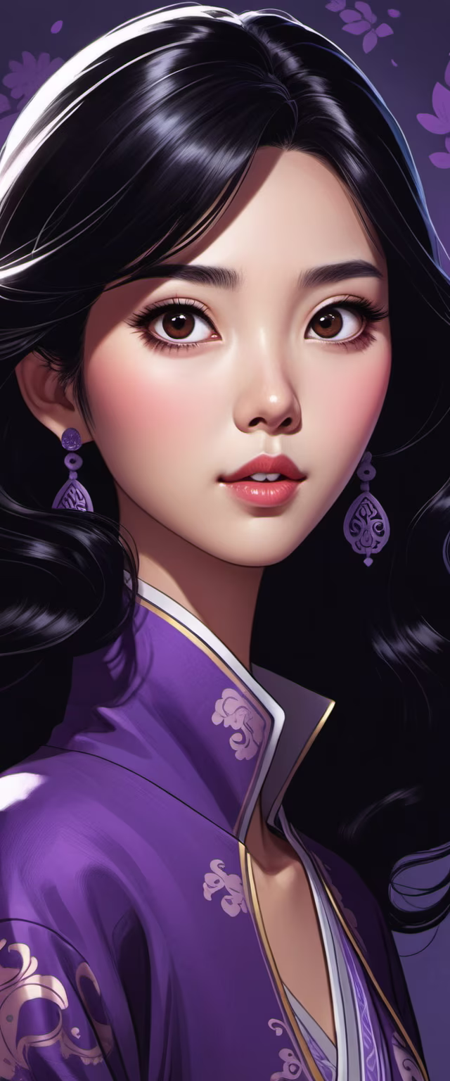 Prompt: a pretty Chinese woman, big eyes, black hair, in the style of Disney animation, dreamy and romantic, strong facial expression, purple and black