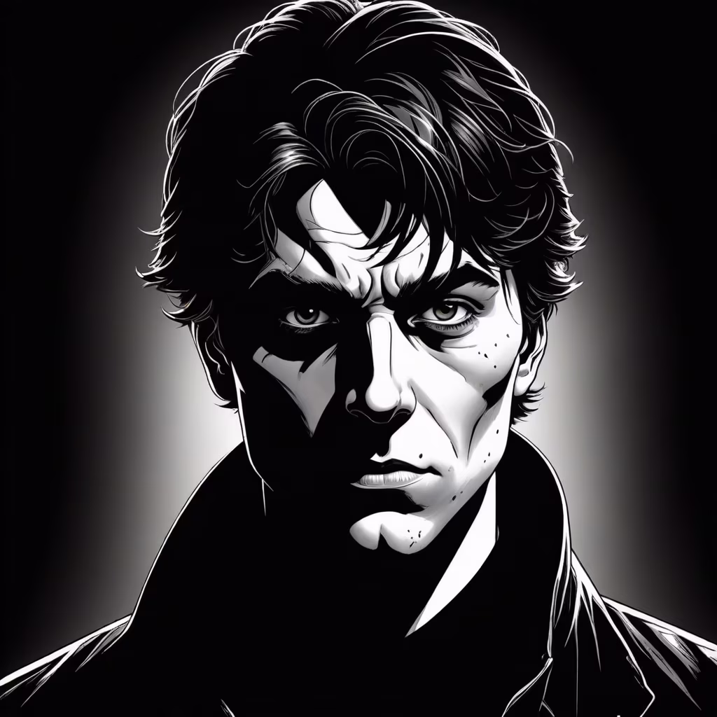 Prompt: intimidating unknown person face hidden in shadow, centered portrait, black tones, no background