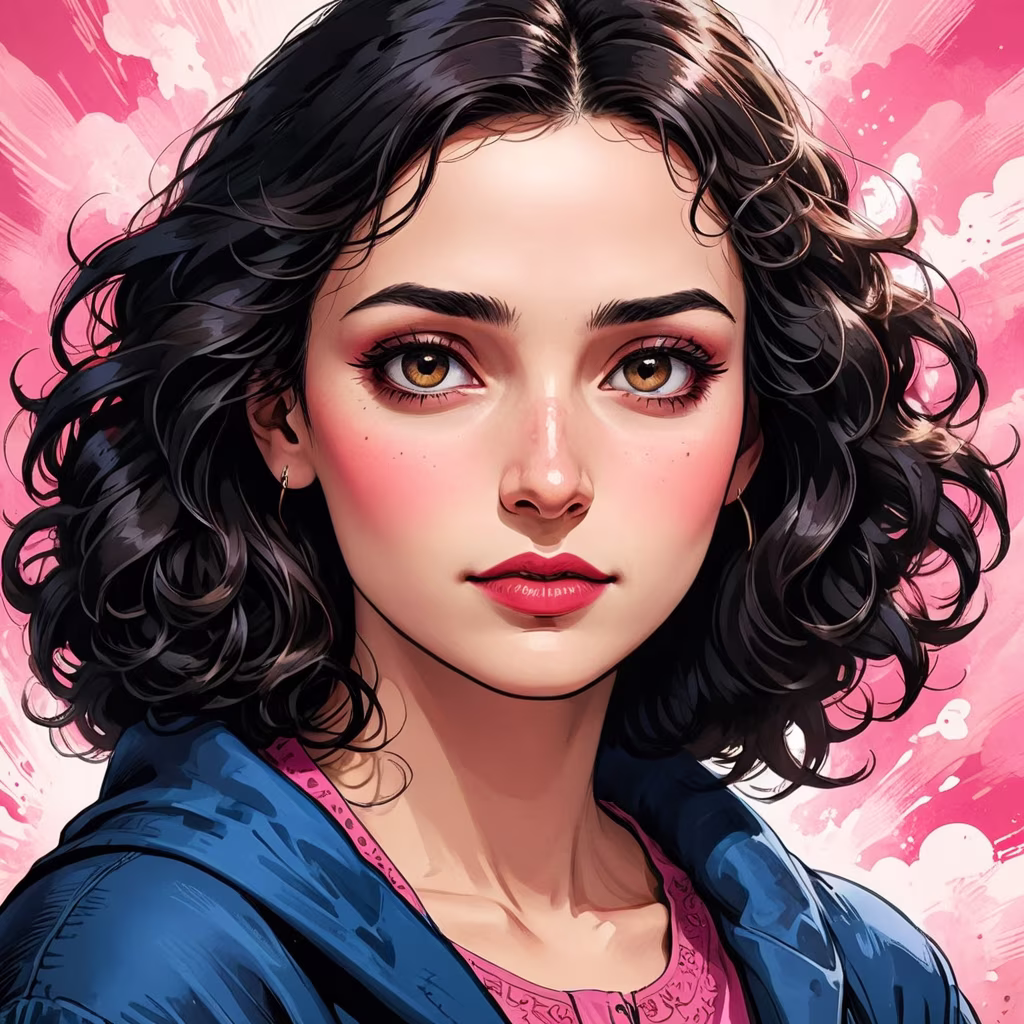 Prompt: portrait of a woman with long black hair, dark brown eyes and rosy cheeks,