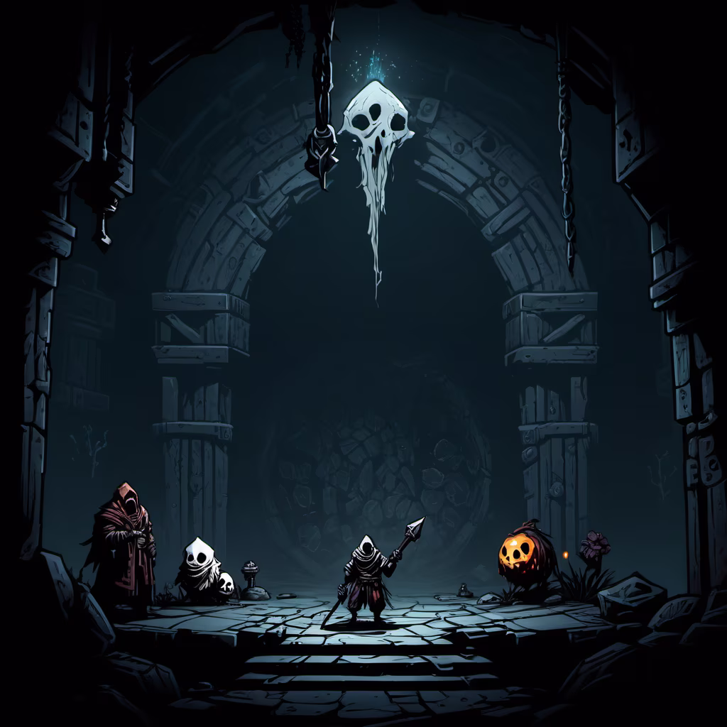 Prompt: screenshot from a game: darkest dungeon mixed with ori and the blind forest, dungeon level, environement only, no characters, side view, interior, underground, treasury