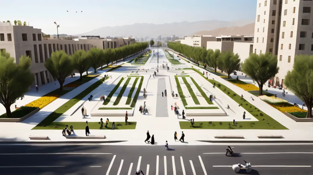 Prompt: sanandaj azadi square with 5 streets and one pedestrian cottections, walkable redesign, sustainibility, ecological, crowded