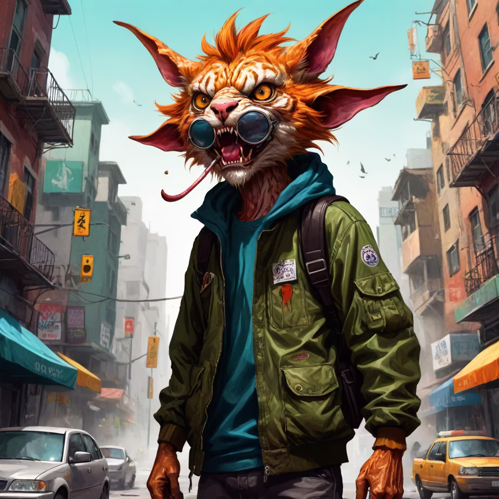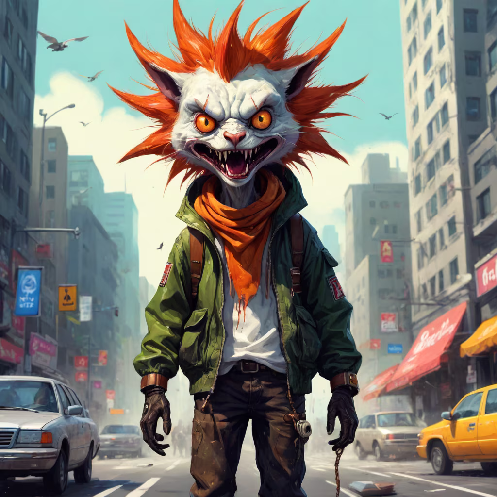 Prompt: Mad Max 4 movie genre, a short brown haired Chinese girl, big eyes, 24 years old, wearing a grey sports hoodie, light blue patterned pajama trousers, red socks, black trainers, carrying a bazooka, is aiming it right in front of her, and she gives a crazy sinister grin, frontal vision
