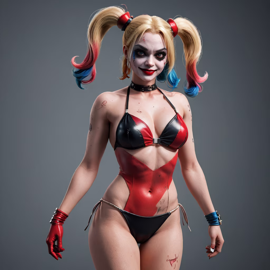 Prompt: Realistic image of Harley Quinn in sensual poses, wearing a bikini in the colors of her costumen high-quality, photo realistic style. --no deformed face, eyes, nose, mouth, hands, arms, or legs. --size 9:16 -