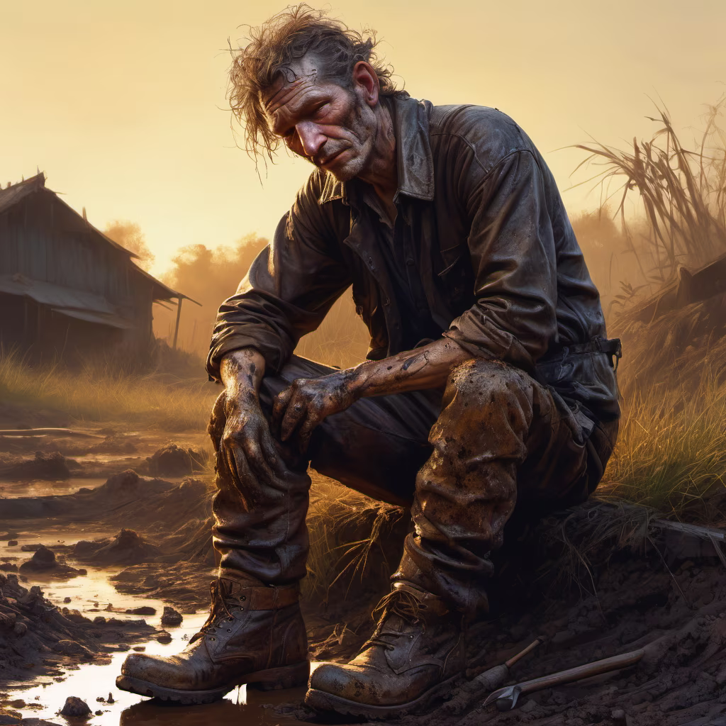 Prompt: A mud-caked laborer finds rest, concept art, Rembrandt lighting, worn leather boots and tattered pants soaked with mud and grass stains, veins of rich brown earth creep along his bare arms and neck, drained eyes closed as the golden light of dusk washes over weary features, fantasized portrait of the working class by Jacek Yerka and Craig Mullins, brush strokes, chiaroscuro lighting, tattered workers attire, worn leather boots, mud-soaked trousers, weathered hands and face, veins of soil, golden hour light, 16K masterpiece.