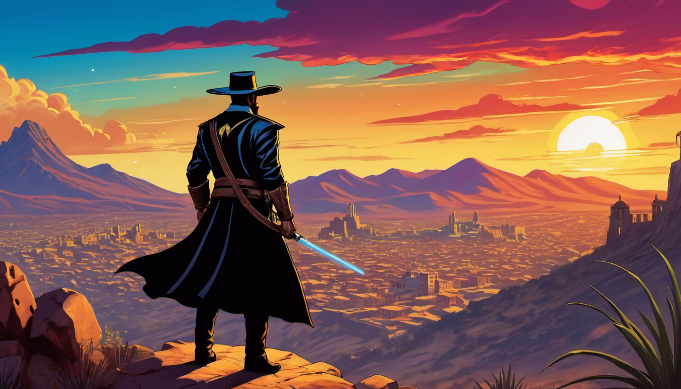 Prompt: 2d cartoon characters, full body, Zorro (Alain Delon), in black clothes, black cloak, black hat, black mask over the eyes, galloping horseback through an ancient Mexican (city), trees, sunrise, against a background of rocky mountains, condor, western, wild west, glow, halo, sparks, lightning, splashes of light, rays of light, aura, ready to use force and arms, dynamic action pose, dnd character, Marvel cartoon style, 1800s, animated TV series, dark light, colorful, vibrant color, high detailed background, high detail, best quality, by Johnny Bruck, Chris Foss, Giger, Boris Vallejo