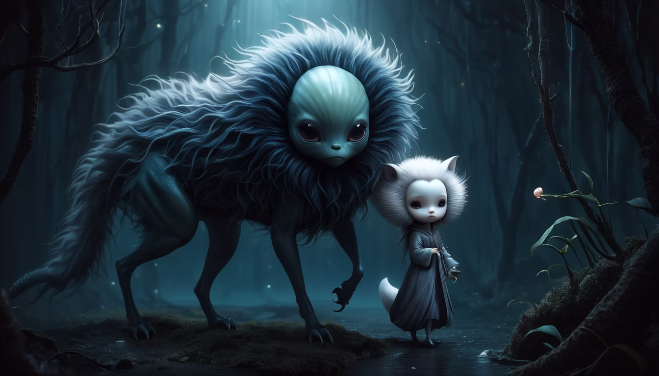 Prompt: (artist AntonSemenov:1.1),(artist Kaws:1.2), (artist Nicoletta Ceccoli:1.3), (The image is digitally painted with a high level of detail and a focus on lighting and textures. It is trending on artstation and has a cinematic quality), 8K, ProPhoto RGB, Visual Perception, Accent Lighting, Ray Tracing Reflections, Textured, Ray Traced, TXAA, De-Noise, Shaders, Post-Production, CGI