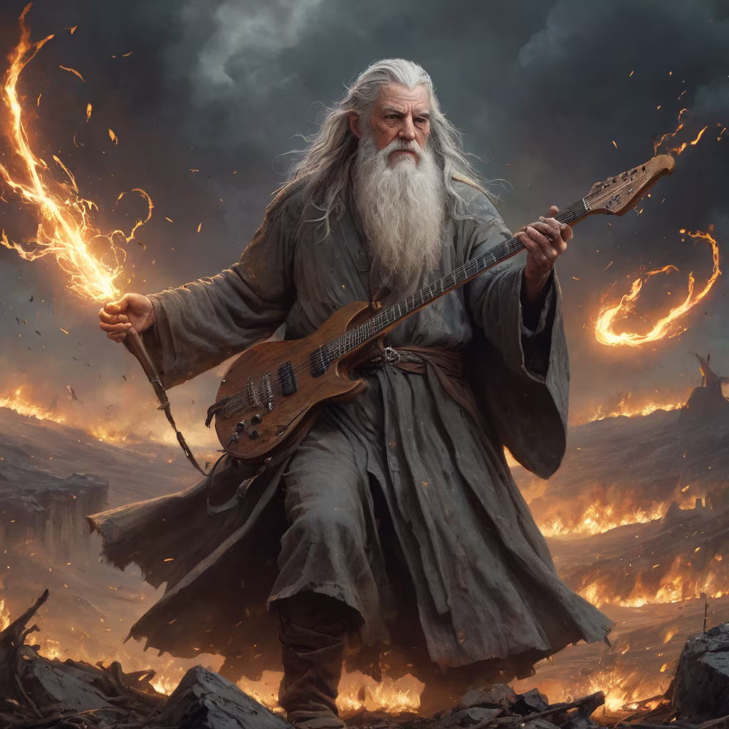 Prompt: Lord of the Rings scene, Gandalf shredding on electric guitar as magic swirls, a field ablaze with magical fire and lightning strikes, masterpiece, textured speedpaint with large rough brush strokes and paint splatter by Jeremy Mann, Carne Griffiths, Junji Ito, Robert Oxley, Ismail Inceoglu. Trending on ArtStation, particles, oil on canvas, highly detailed fine art, ink painting, hyperrealism, Pixar gloss, polished, Anato Finnstark, Android Jones, Darek Zabrocki, Boris Vallejo, David.
