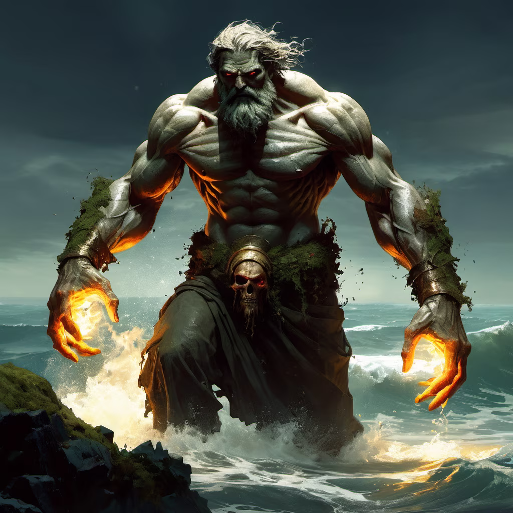 Prompt: mythical greek titan undead stone giant monster under the tides, burning hands, lighning in hands, flaming eyes, moss beard, waves, counter diving shot, chiaobscuro by jeremy mann and Craig Mullins and Zdzisaw