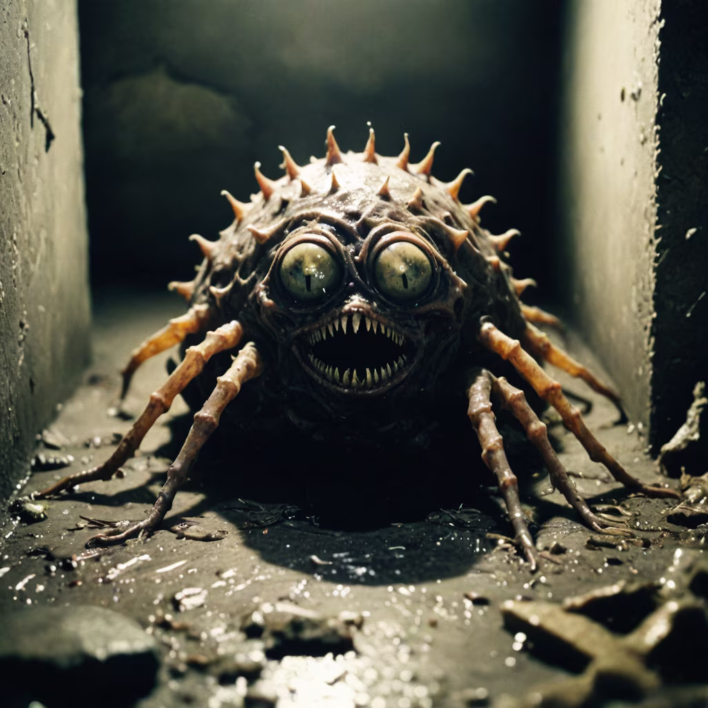Prompt: wide view, strange robot creature, horror, octane render, macro
